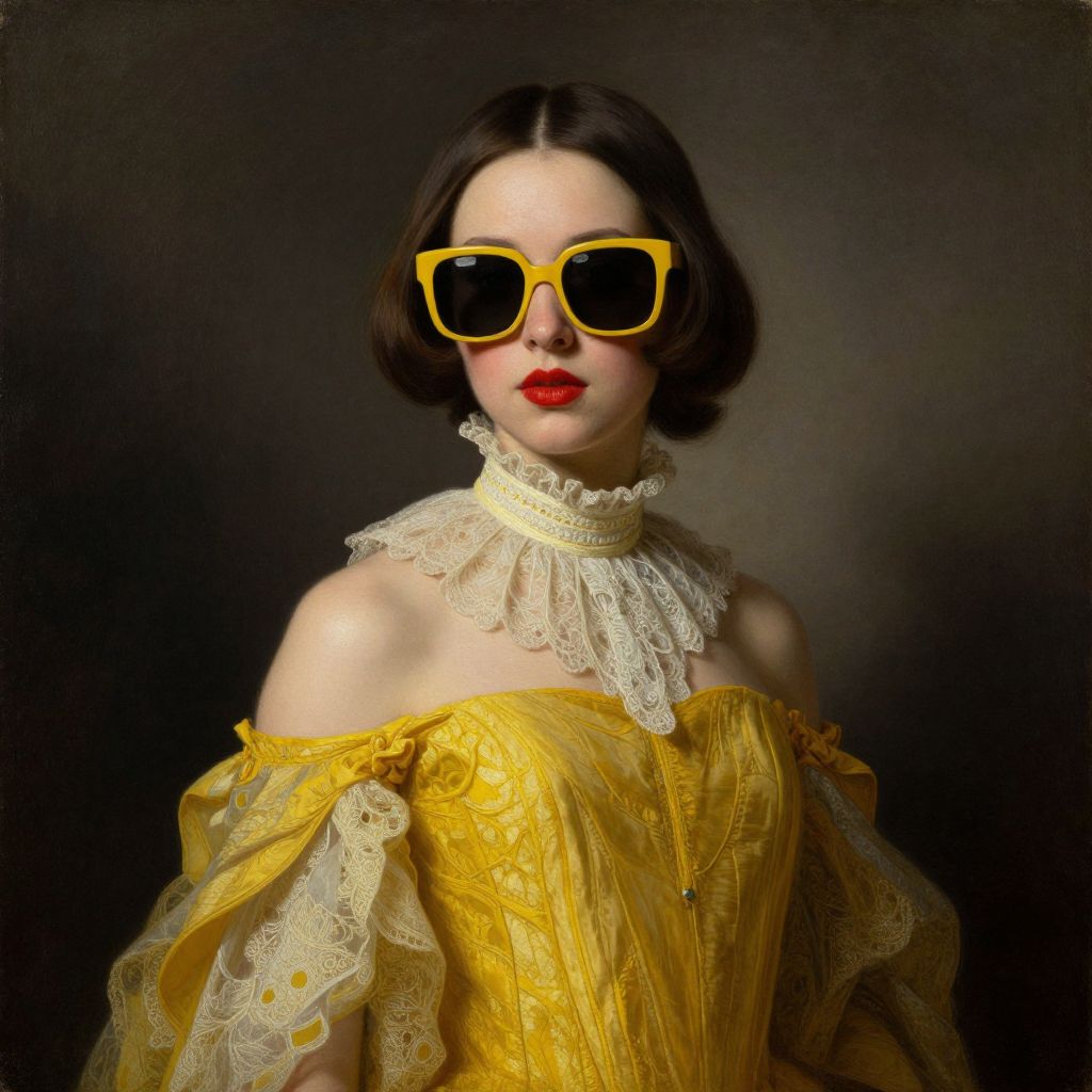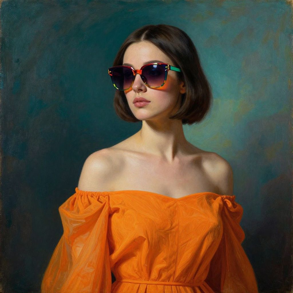 The image is a hyperrealistic oil painting of a sophisticated, beautifully proportioned young woman with a perfect face. She is adorned in a long, shoulder-less, elegant dress of vibrant yellow and orange hues, which contrasts strikingly with the dark background. Her hair is styled in a sleek, voluminous bob, adding to her polished appearance. She wears large, futuristic sunglasses with a rainbow-colored lens that reflects the surrounding colors, creating a mesmerizing effect. The background is a gradient of soft, pastel colors, transitioning from a warm orange to a cool blue, which complements the subject's attire and adds depth to the composition. The overall scene is reminiscent of the Dutch masters of the 18th century, with its attention to detail, realistic portrayal, and harmonious color palette.