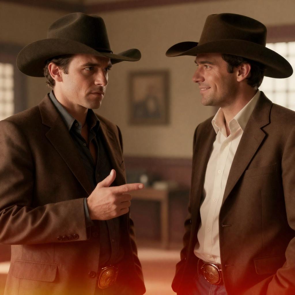 Photograph of two men in a Western-themed setting. One in green shirt, dark hair, holding cup, smiling. Other in beige jacket, white hat, orange scarf, leaning forward. Background: posters, "Super" sign, "Rodeo Down Daddy" sign. Intense smile on hat-wearing man.