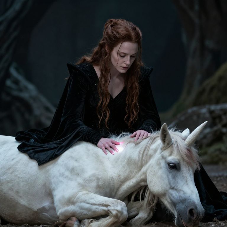 A photograph-like CGI image depicts a fair-skinned, red-haired woman with wavy hair, wearing a black, high-collared, velvet gown, gently touching a white unicorn lying on the ground. The unicorn has a soft, glowing light on its back, and its blue eyes gaze downward. The dark, forested background with twisted, shadowy trees creates a mystical atmosphere. The woman's focused expression and the unicorn's serene demeanor suggest a bond of care or magic. The texture of the unicorn's fur is detailed and realistic, contrasting with the woman's smooth, elegant gown.