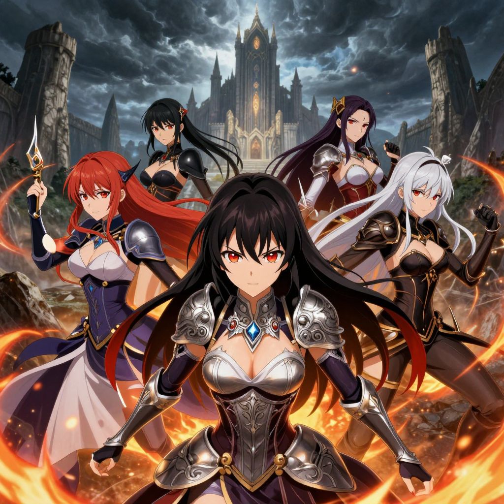 Female anime characters with red eyes in a fantasy realm, adorned in elegant warrior armor with intricate engravings, dramatic battle scene with magical fire effects, intense and determined expressions, epic landscape with towering castles and stormy skies
