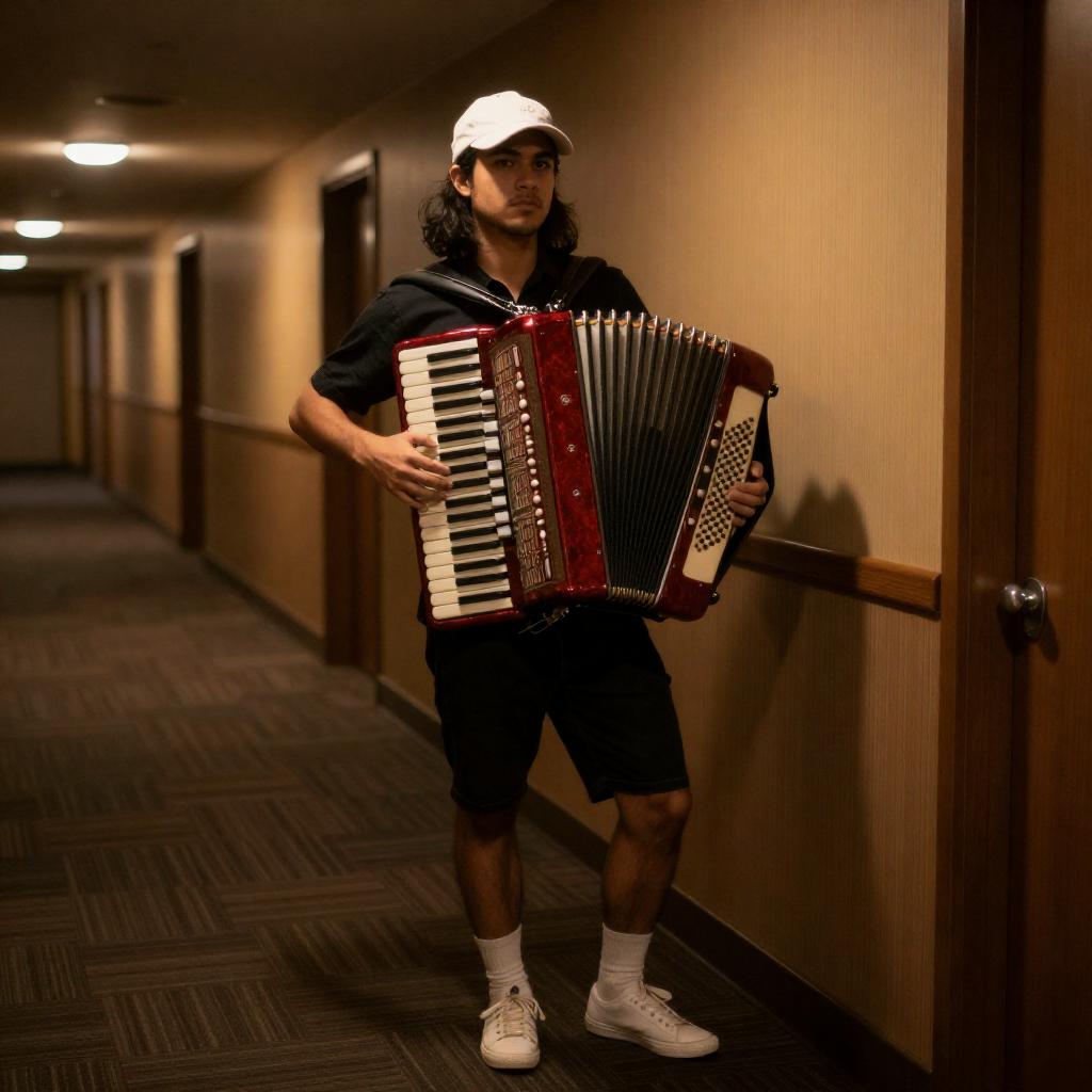 Photograph of a young man with long dark hair, wearing a white cap, black shirt, white socks, and white sneakers, standing in a dimly lit hallway with patterned carpet. He holds a large red accordion, leaning against a wooden wall. His expression is serious, and the hallway has warm, yellow lighting.