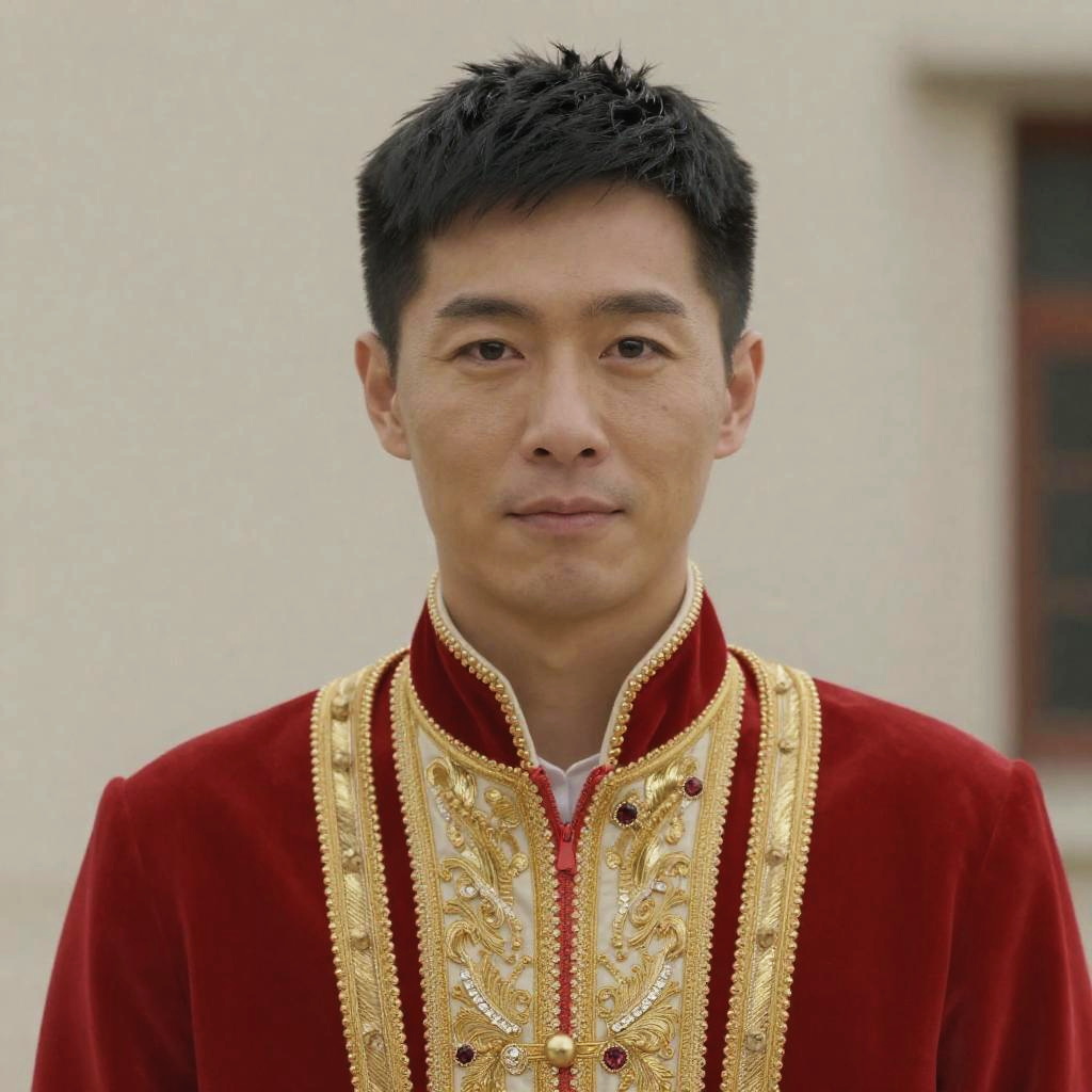 Royal Costume Man, a close up of a man in a red and gold outfit