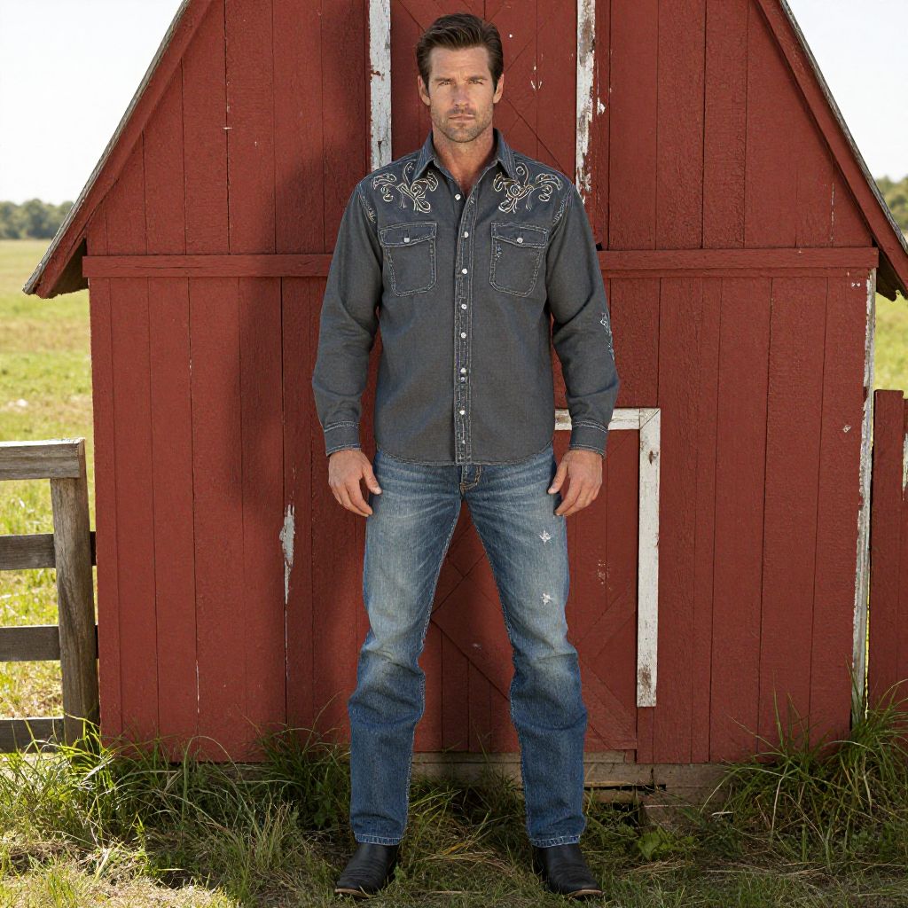 A man, charcoal gray embroidered flannel shirt, distressed medium wash jeans, black cowboy boots, rustic red barn, sun-drenched fields, overhead shot, confident expression, classic Western appeal. Man has masculine face and piercing eyes