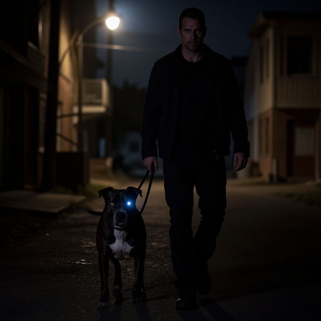 A photograph of a muscular man with short hair, dressed in dark clothing, walking a large black and white dog at night. The man's face is shadowed, and the dog has bright blue eyes glowing in the dark. A streetlamp casts a dim light, illuminating the wet, dark street. Buildings with faint lights are visible in the background, creating a moody, urban atmosphere. The image has a noir, dramatic style with high contrast and low light.