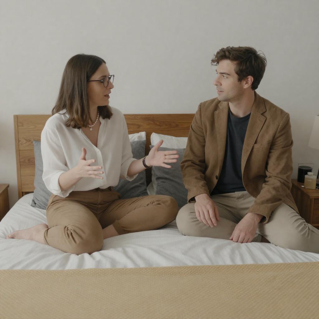 A wide-angle shot of a therapy session set in a minimalist room featuring a classical marble sculpture by Antonio Canova placed on a pedestal between a male therapist and a female patient. The therapist is dressed in a dark suit with a white shirt, while the patient wears a casual outfit with beige pants and a blue patterned top, holding a clipboard. The scene evokes a cinematic atmosphere with soft, natural daylight highlighting the detailed sculpture and the contemplative expressions of the subjects.