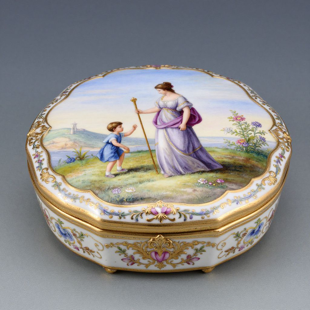 Ornate, round, gold-trimmed box with a colorful, painted scene of a woman in a purple dress and a boy with a staff
