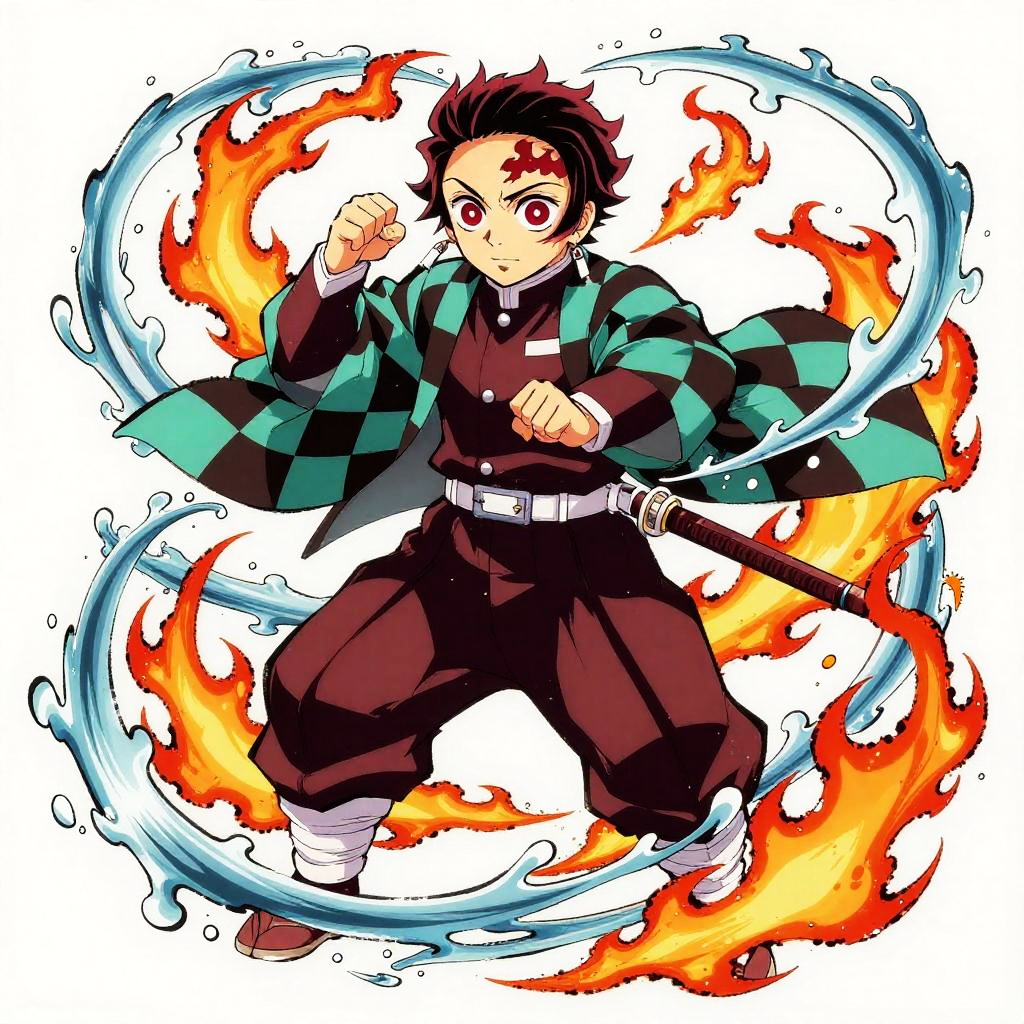 Demon slayer anime girl with fiery red eyes, intricate Demon Slayer uniform, surrounded by swirling water and fire elements, stylized manga art style, powerful stance