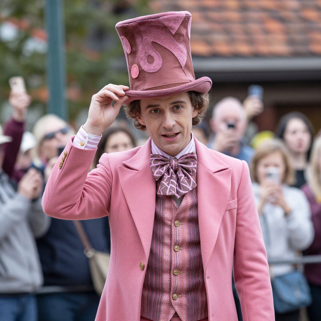 "Willy Wonka Top Hat Costume, man in a pink suit and top hat with a crowd of people behind him"