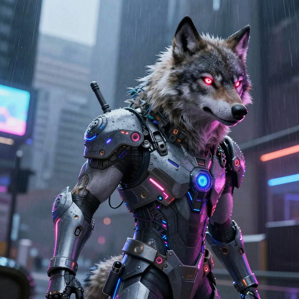 A majestic AI generated animal roaming a cyberpunk cityscape at night, combining natural fur patterns with sleek robotic armor, neon reflections on wet streets, dynamic pose, dark moody atmosphere, highly detailed digital painting, futuristic fantasy