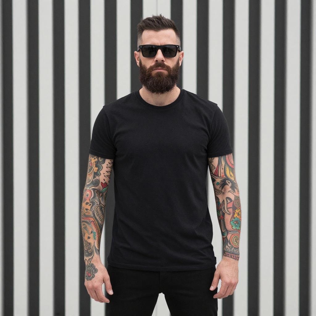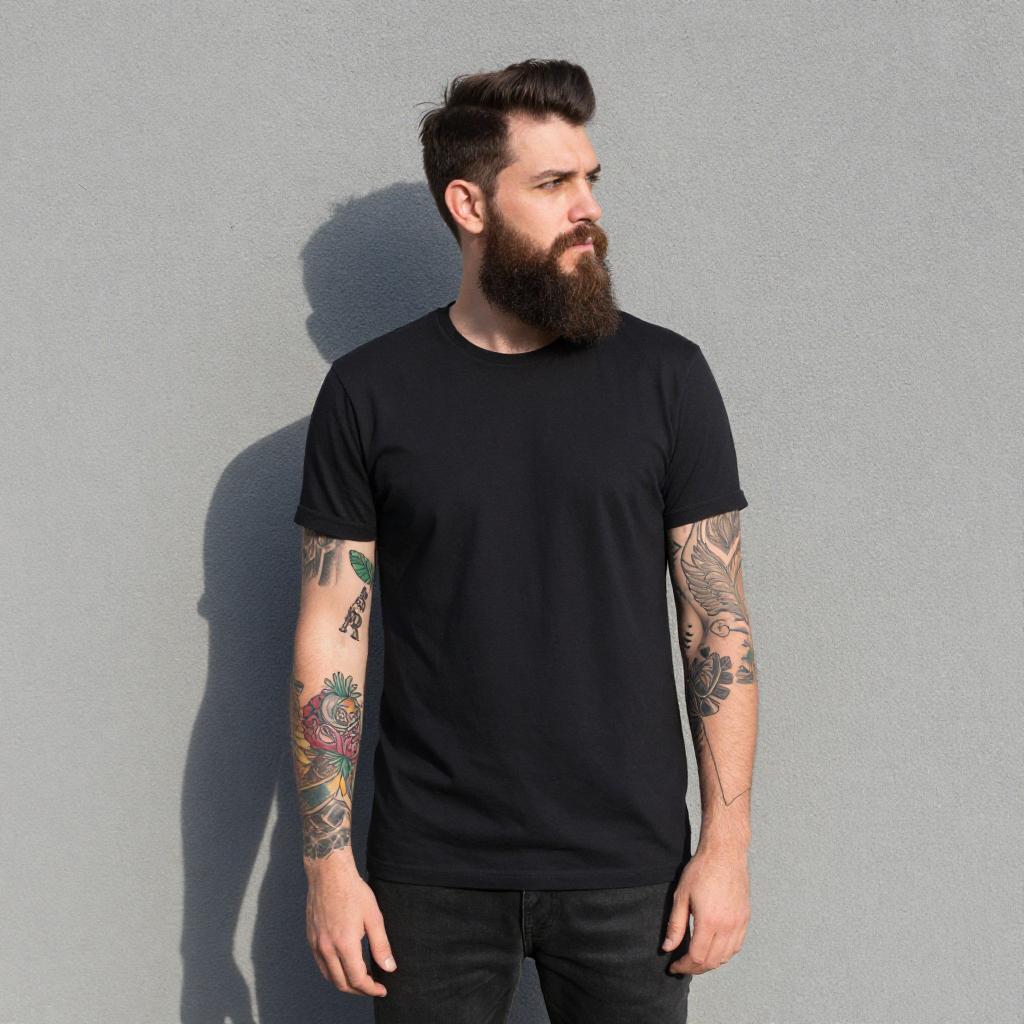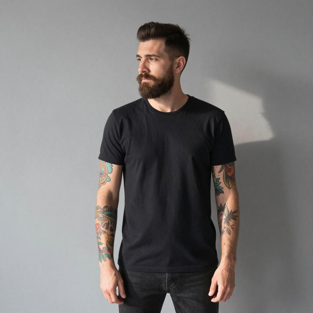 Photograph of a bearded man standing against a gray wall. He's wearing a plain black t-shirt and dark jeans, showcasing colorful tattoos on both arms. His short, dark hair is neatly styled, and he's gazing to the side with a thoughtful expression. Sunlight casts a shadow of his head and arms on the wall, adding depth to the image.