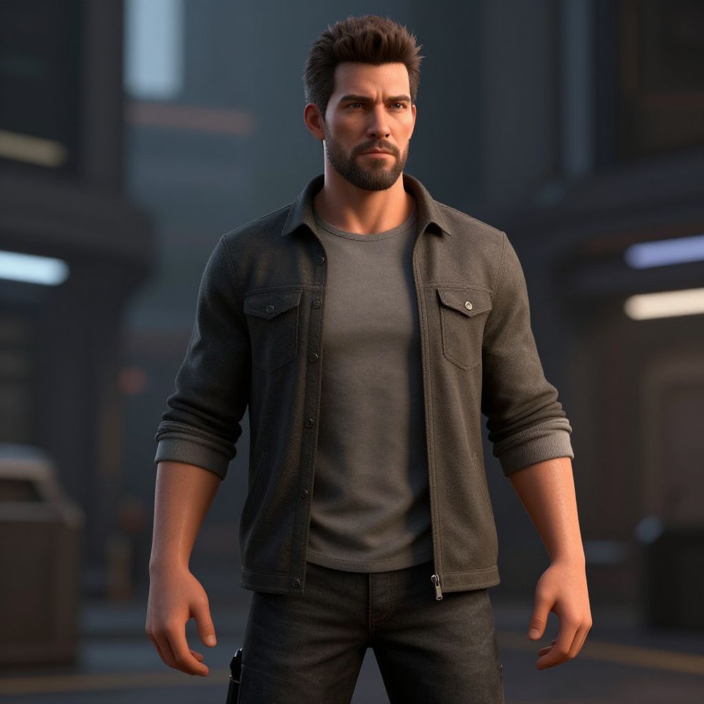 CGI image of a handsome, muscular man with dark hair and beard, wearing a black denim jacket and gray shirt, standing in a dimly lit