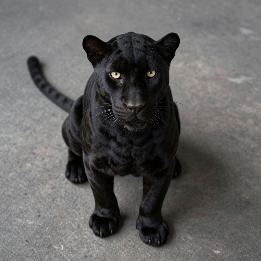 Photograph of a black panther sitting on a gray concrete surface. The panther has a sleek, muscular body with distinct dark stripes and piercing yellow eyes. Its ears are small and rounded, and its tail is slightly curved upwards. The panther's fur is short and smooth, reflecting light subtly. The background is a plain, textured gray concrete floor, providing a stark contrast to the panther's dark coat. The image is sharply focused, highlighting the panther's intense gaze and detailed fur pattern.