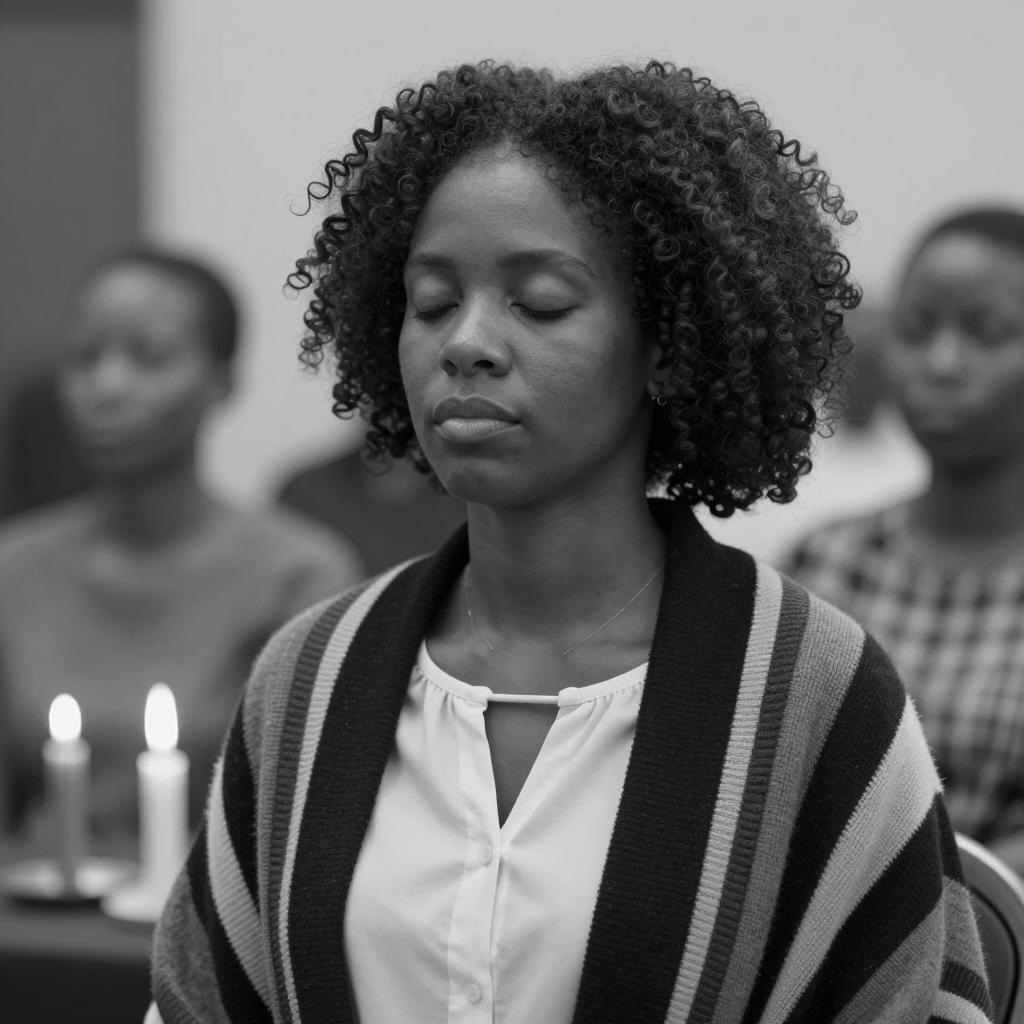 Black-and-white photograph of a woman with dark skin, large Afro hairstyle, and closed eyes. She wears a white blouse with a wide black and beige striped shawl. Background includes blurred figures and candles. Woman's expression is calm.