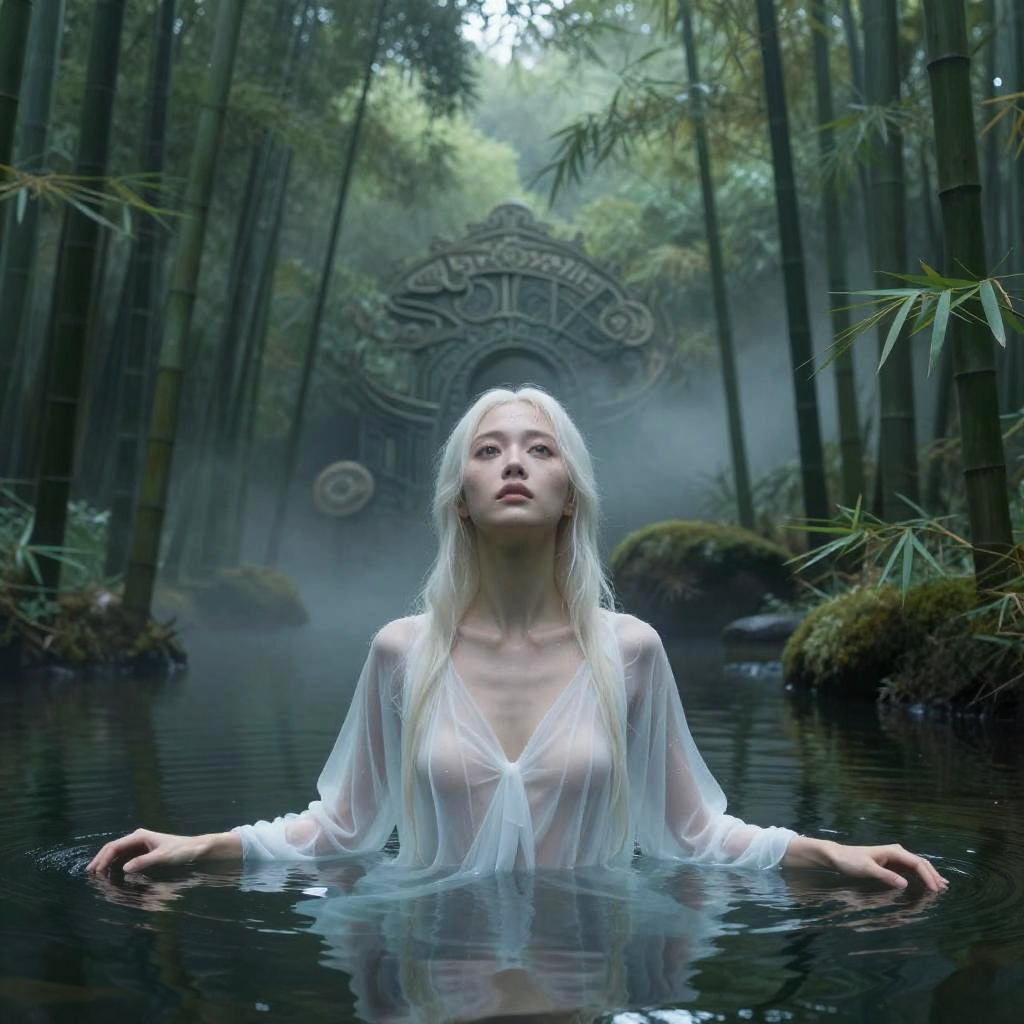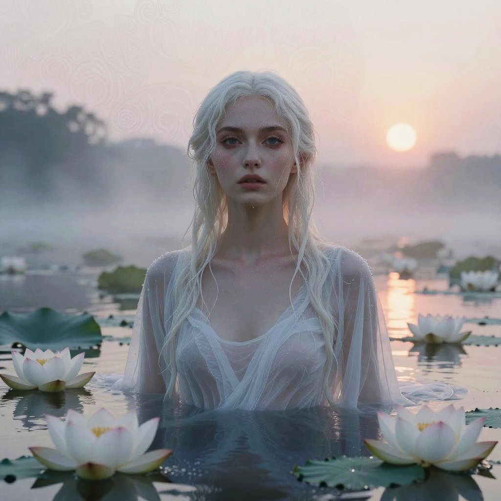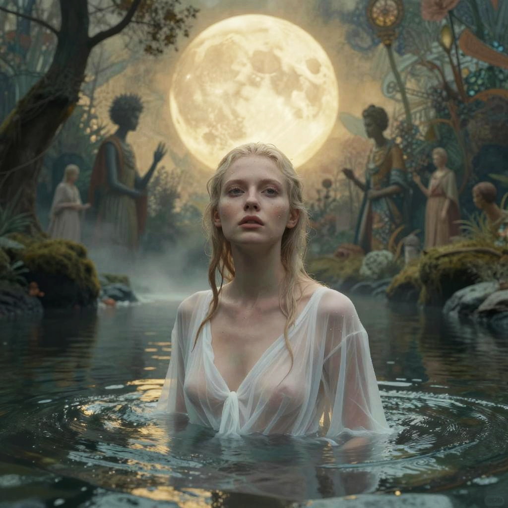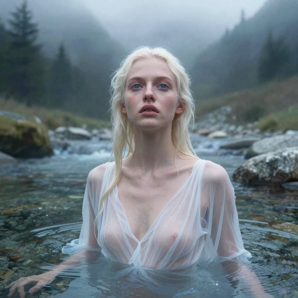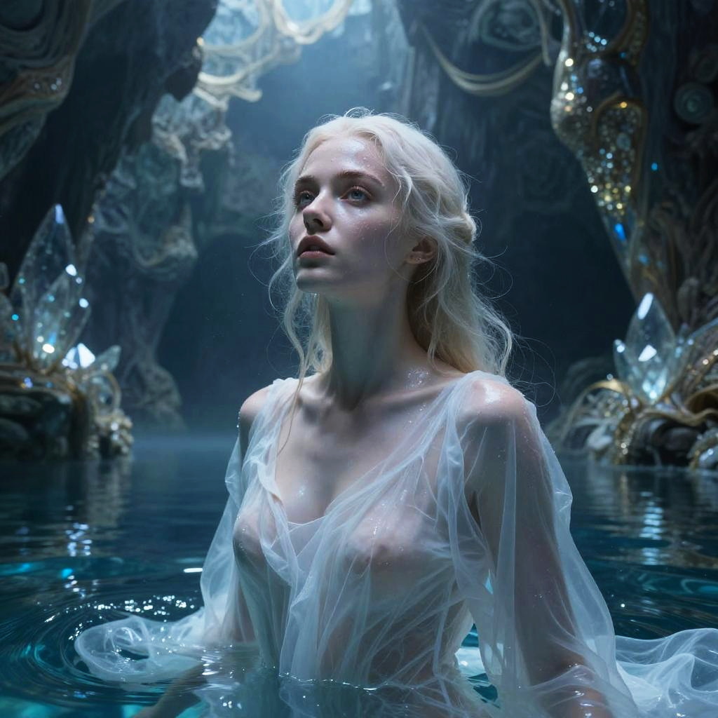 Masterpiece, uhd, 8k, a beautiful wet pale woman in a body of water with transparent wet white dress beneath ancient willow roots, wide open ultradetailed eyes, luna, dusty ethereal rays, mist, intricate detailed background, natural mystical realism, by karol bak, fantasy with water magic, inspired by Hedi Xandt, by kirsty mitchell, inspired by David LaChapelle, inspired by james christensen, by natalie shau, inspired by Dino Valls, by steven klein, by david la chapelle, by Galen Dara