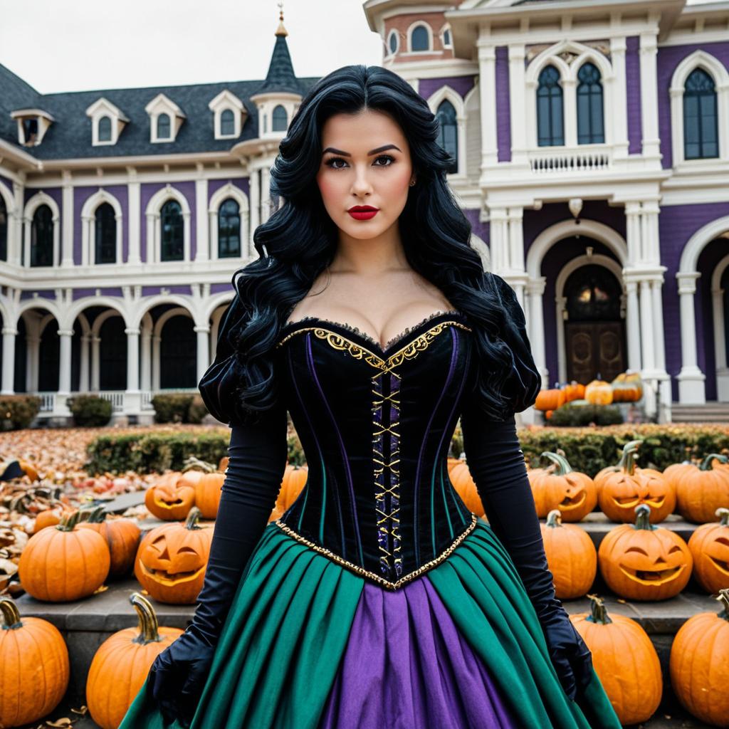 Photorealistic image of a woman dressed in a Disney villain-inspired cosplay costume standing outdoors in front of a Renaissance-style building. She wears a purple and black corset with gold accents, a green pleated skirt, black gloves, and has black wavy hair with red lipstick. The scene features carved pumpkins surrounding her, evoking an autumn and Halloween atmosphere during daytime.
