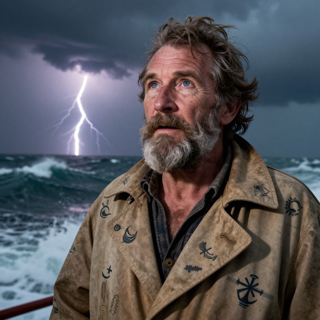 Photograph of a weathered middle-aged man with a graying beard and blue eyes, standing on a stormy sea. He wears a worn, beige coat adorned with black nautical symbols, over a dark shirt. The man's expression is contemplative as he gazes upward at a bright, jagged lightning bolt striking the dark, cloud-filled sky. The choppy ocean waves are visible in the background, adding to the dramatic atmosphere. The image has a high-contrast, almost surreal quality, emphasizing the intensity of the storm and the man's rugged appearance.