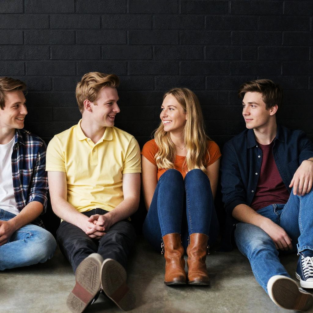 Photograph of four young adults sitting on the floor against a dark brick wall. Two men, one in a blue plaid shirt, the other in a yellow polo, sit on the left and center. Blonde woman in an orange top and brown boots sits in the middle, smiling. Young man in a blue jacket and red shirt sits on the right, looking to the side. Casual clothing, brown shoes, white sneakers. Background is dark brick.