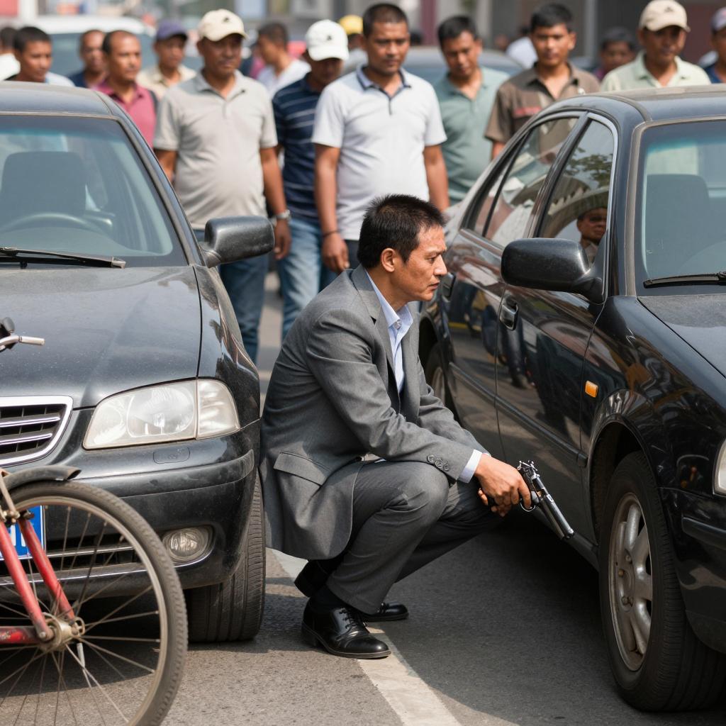 Photograph of a man in a blue car pointing a gun out of the driver's side window. Another man in a brown jacket stands in the foreground. The car's roof is blue. The background shows a blue vehicle. The gun-wielding man has a focused expression. Two people. Daylight.