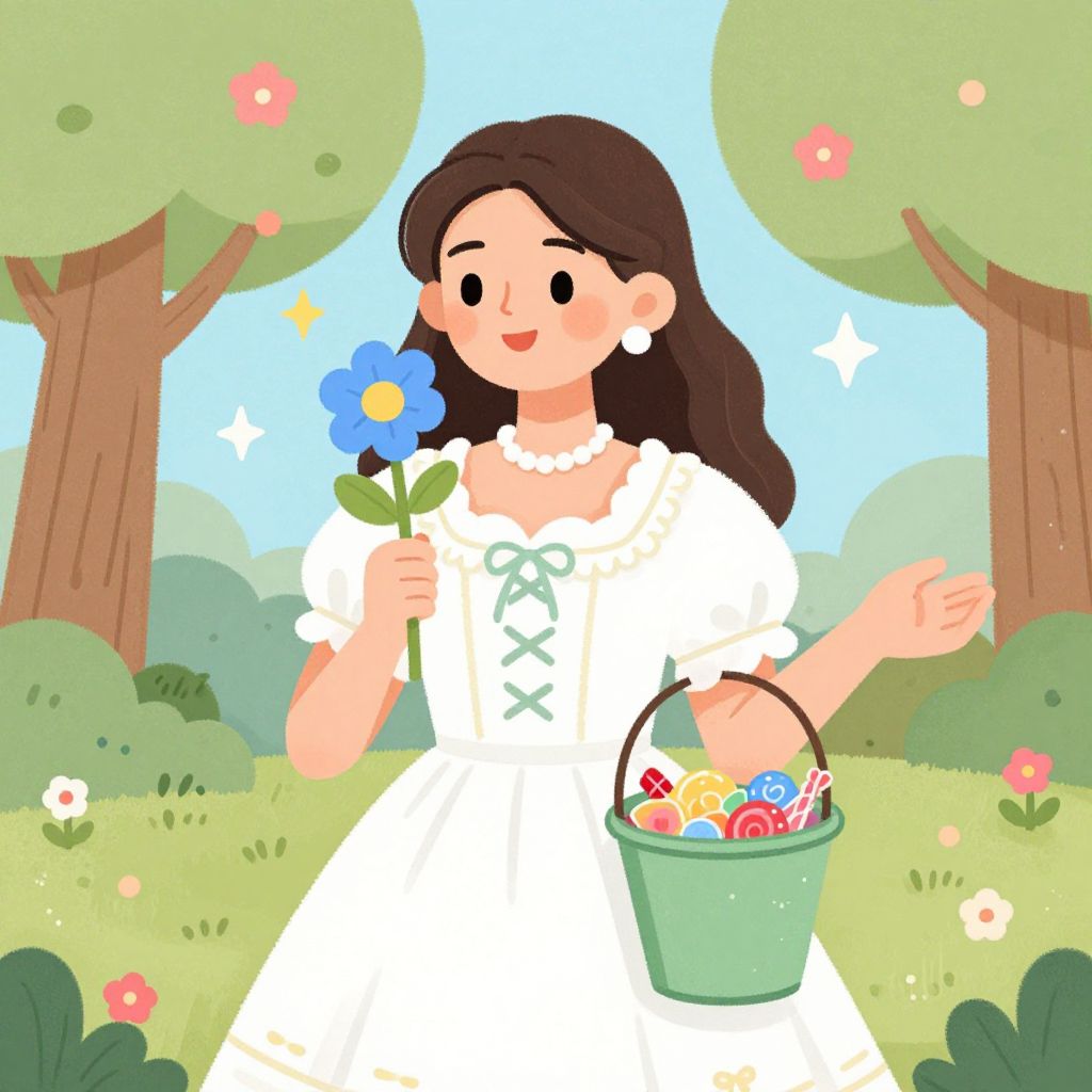 Cartoon illustration of a smiling woman with long brown hair, wearing a white dress, holding a blue flower and a green basket with colorful candies, standing