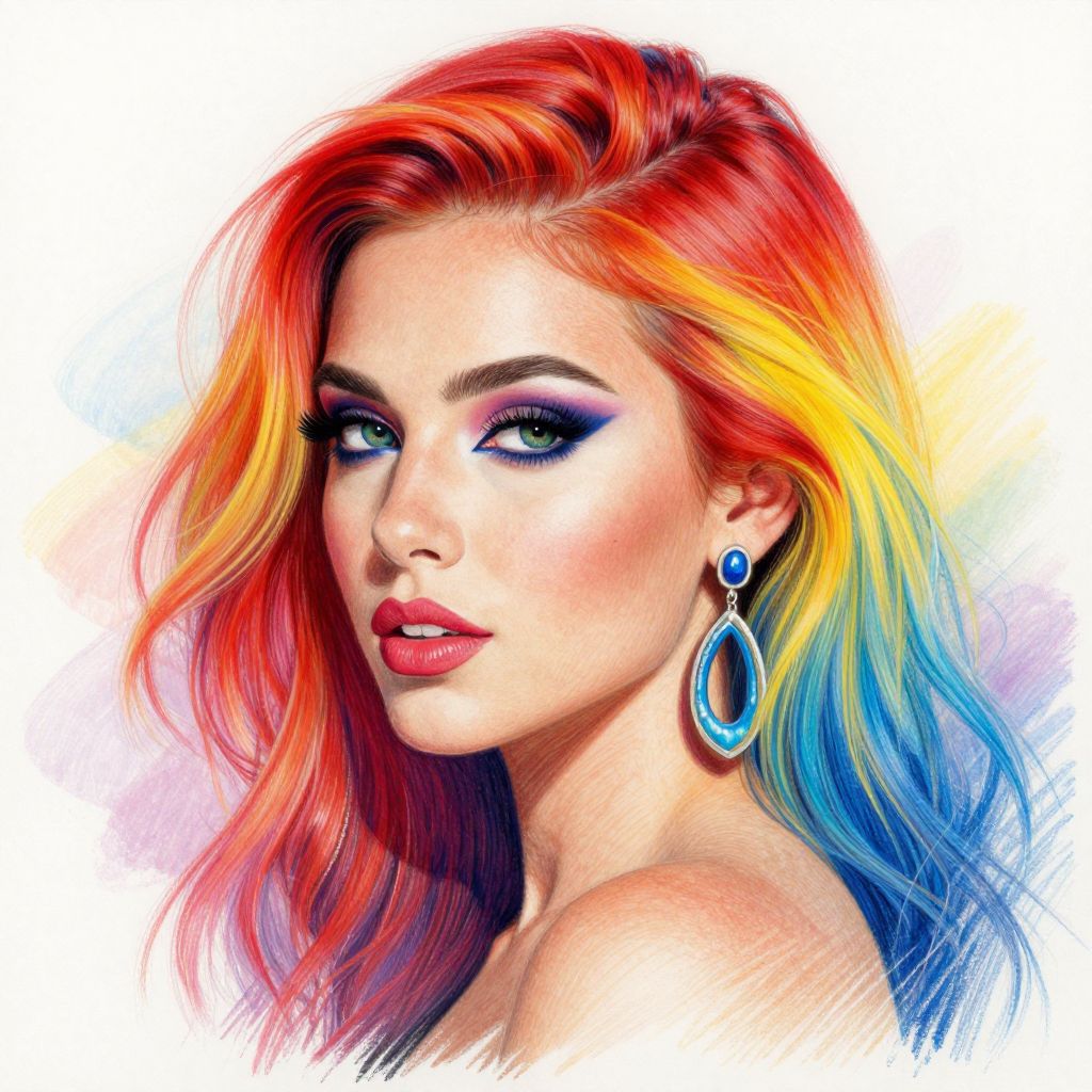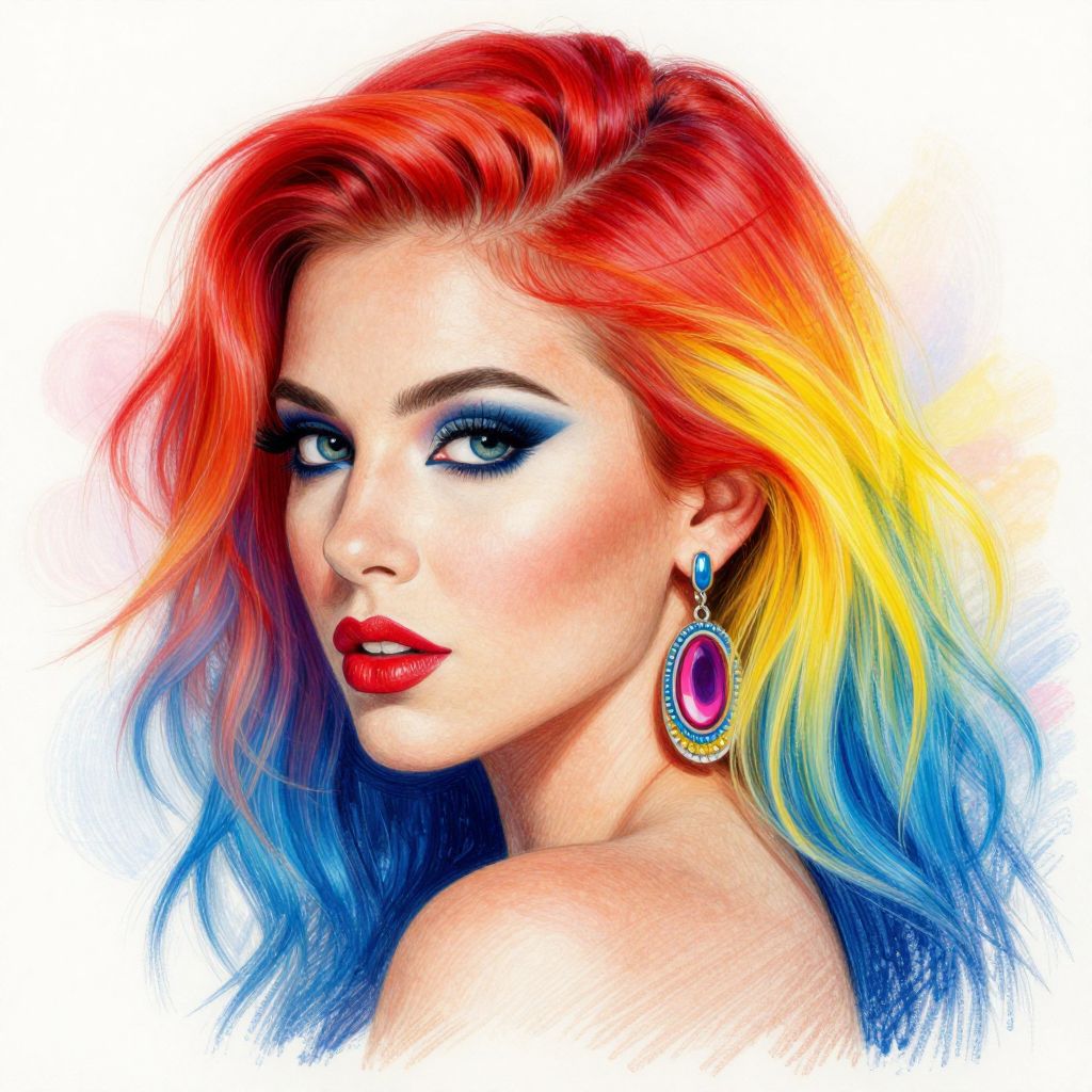 A vibrant digital artwork featuring a woman with vividly colored hair transitioning from red to yellow and blue, rendered in a highly detailed and expressive style reminiscent of Morgan Davidson's colored pencil drawings, showcasing bold makeup and a striking earring against a soft, ethereal background.
