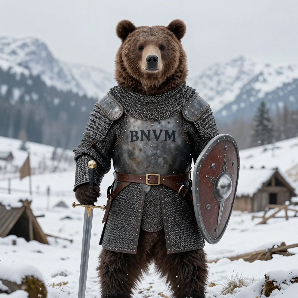 A stocky bear dressed as a medieval knight wearing detailed rustic chainmail armor and holding a sword and shield. The bear's chest plate displays the letters 'BNVM'. The scene is set in a snowy, mountainous battlefield with a serious and determined expression on the bear's face.