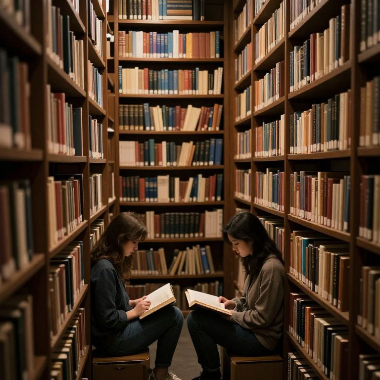 Photograph of two young women with long brown hair, seated on wooden chairs in a narrow library aisle. They are focused on reading open books, with one wearing a dark blue sweater and the other a beige cardigan. The background features tall, wooden bookshelves filled with colorful, neatly arranged books, extending into the distance. Warm, soft lighting highlights the books and creates a serene, studious atmosphere. The women are positioned facing each other, creating a symmetrical composition.