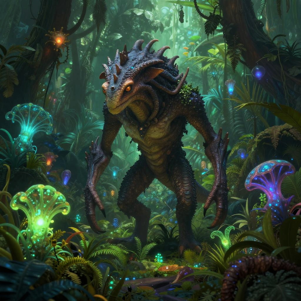 A detailed fantasy artwork depicting an alien creature standing in a lush jungle environment filled with bioluminescent plants. The creature has reptilian features, textured skin with spikes, and a mystical aura as it blends with the vivid green and glowing surroundings. The scene is richly textured with glowing flora, creating an immersive and otherworldly atmosphere.