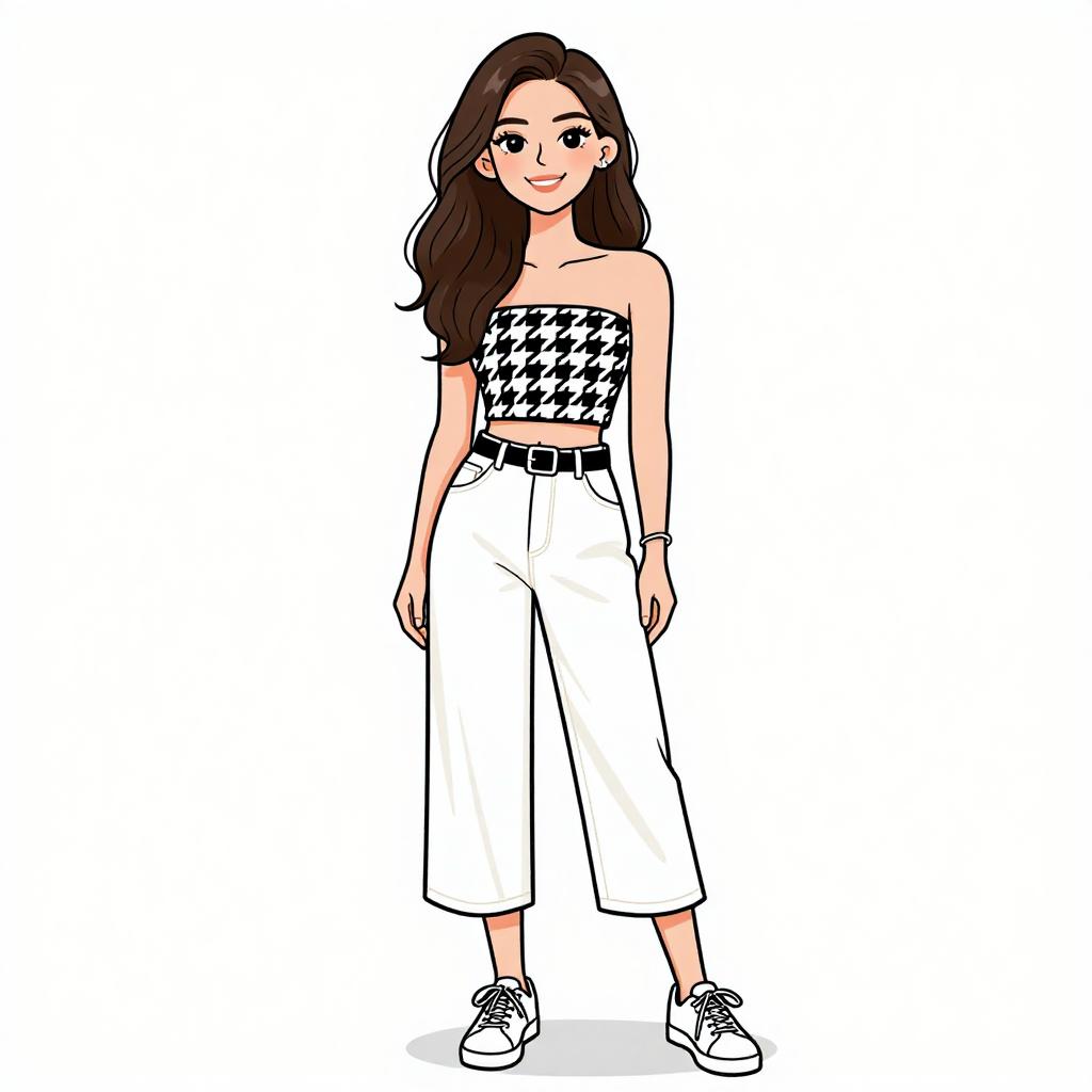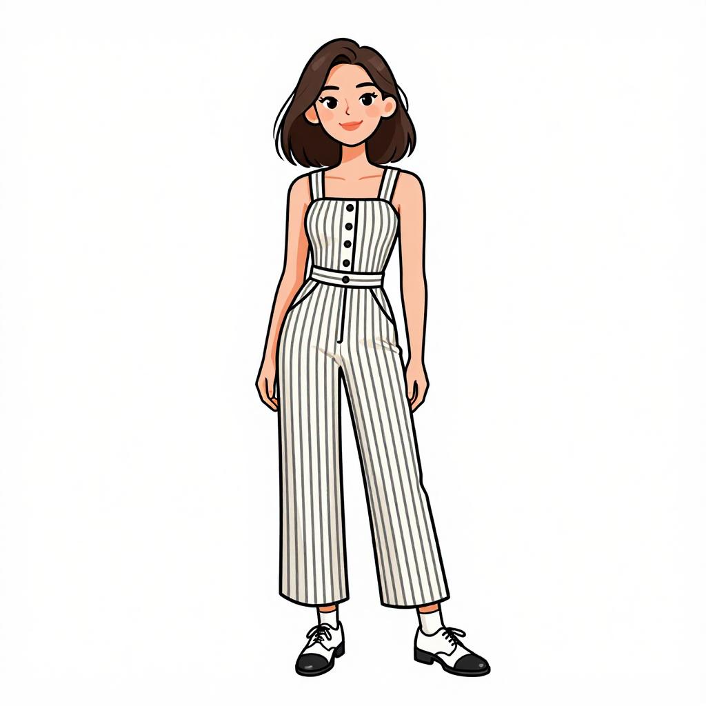 Digital illustration of a young woman with fair skin and shoulder-length dark brown hair. She wears a white, sleeveless, button-up jumpsuit with vertical black stripes, a belted waist, and black buttons down the front. Her outfit is paired with white ankle socks and black loafers. She stands with a slight smile, arms relaxed at her sides. The background is plain white, emphasizing her stylish, casual attire. The drawing style is clean, with bold outlines and minimal shading, resembling contemporary digital fashion illustrations.
