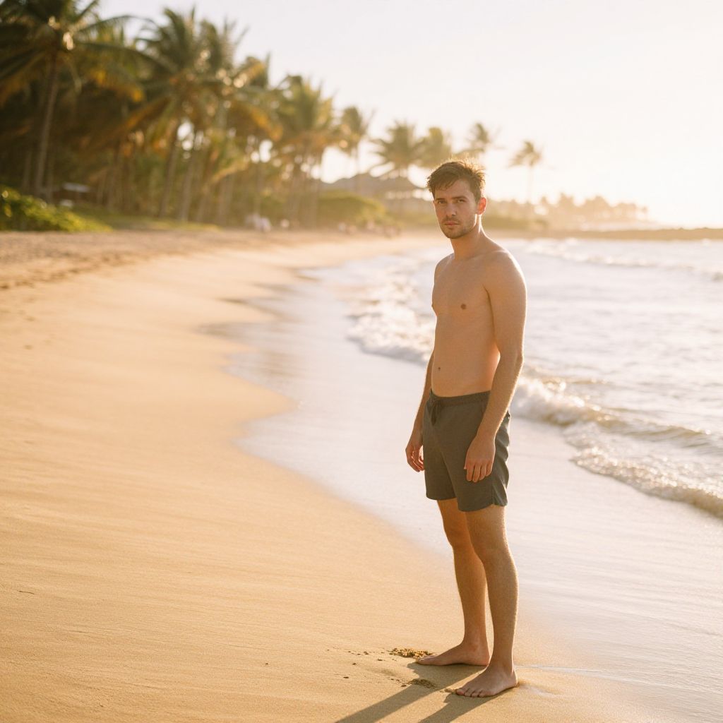 Photograph of a young, light-skinned, athletic man standing on a sunlit, sandy beach. He is shirtless, wearing dark gray shorts, and barefoot. His short brown hair is slightly tousled. Palm trees line the left side, with the bright sun casting a golden glow and creating a long shadow behind him. The ocean is visible on the right, with gentle waves lapping at the shore. The sky is clear, enhancing the warm, serene atmosphere. The man stands slightly off-center to the right, looking directly at the camera with a neutral expression.