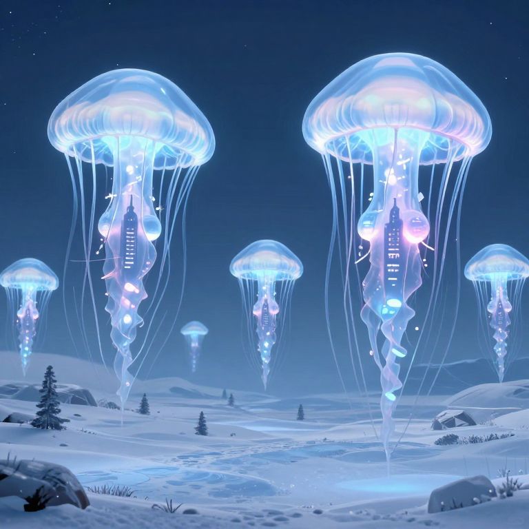Digital art of glowing blue jellyfish with luminescent bodies floating above a snowy landscape at night, with distant trees and a starry sky.