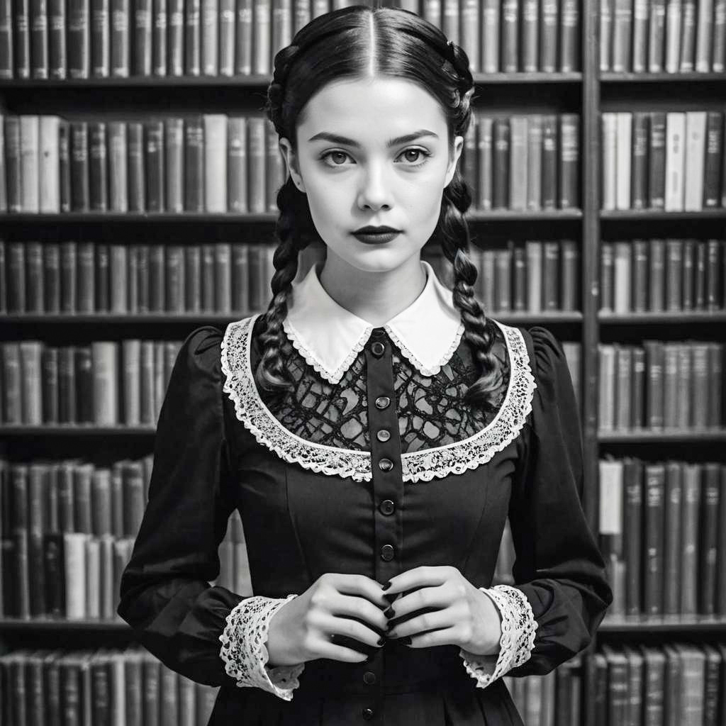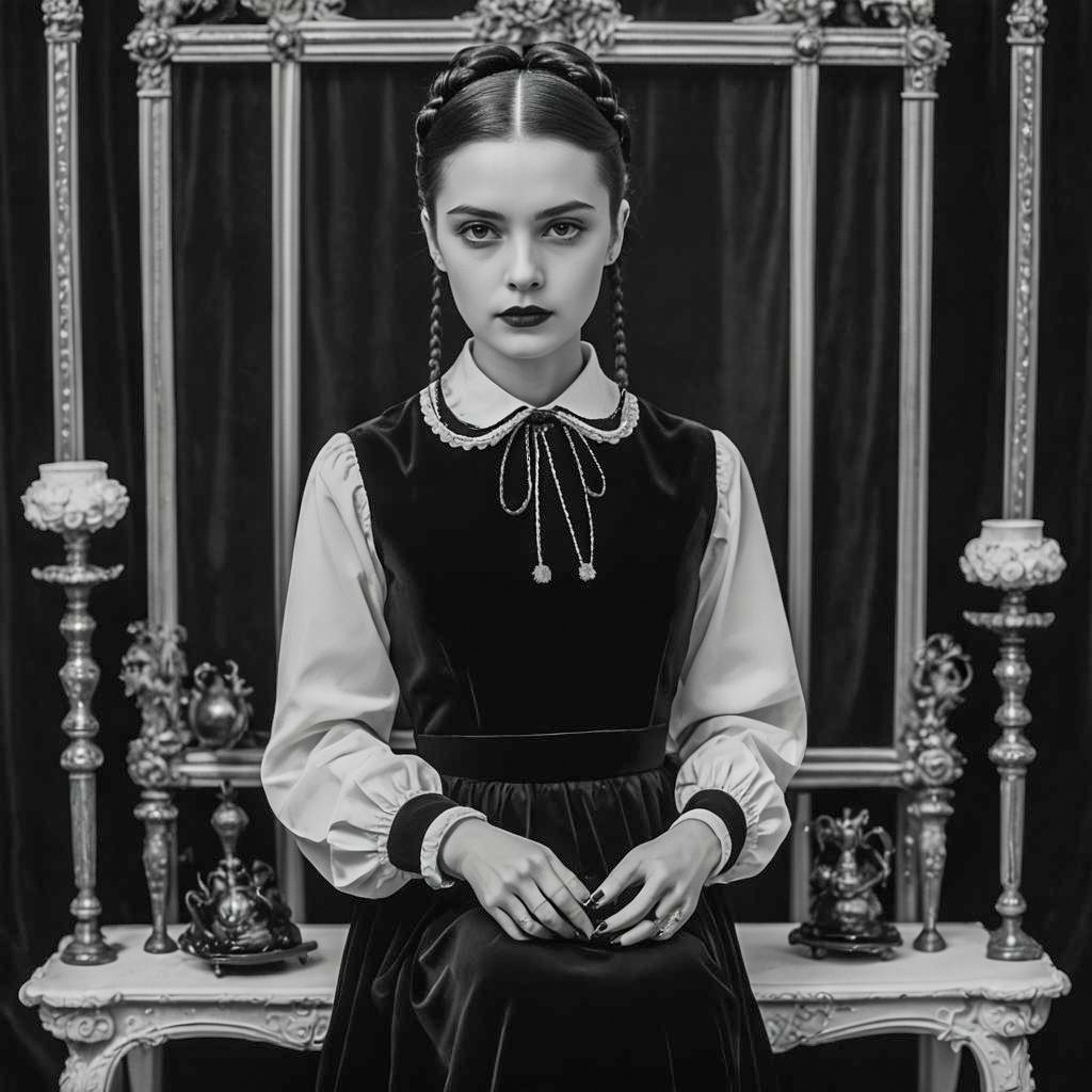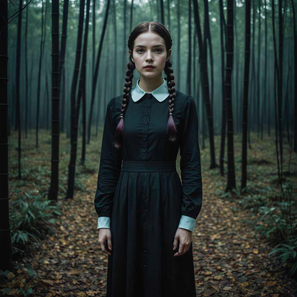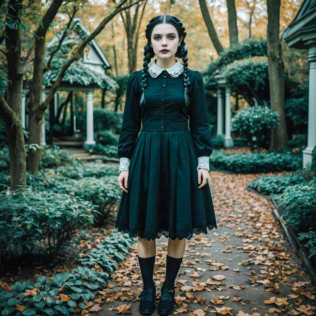 Photo of a Proportionate Body woman, Pixie Cut, Wednesday Addams outfit, black minimalist dress with a white collar, long sleeves, and braided pigtails, Slate Blue Cotton, vintage shoes, urban rooftop, ethereal lighting