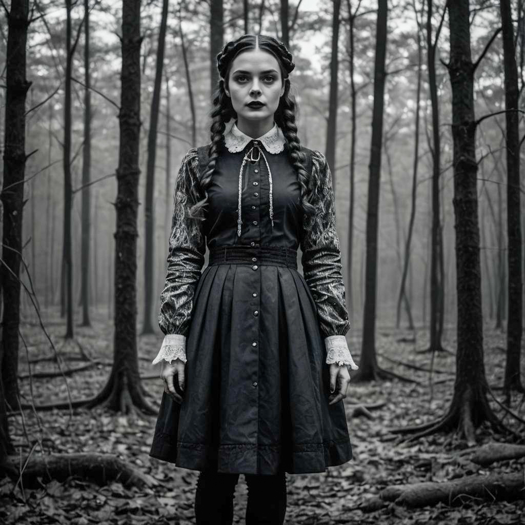 Woman in Wednesday Addams Outfit on Urban Rooftop