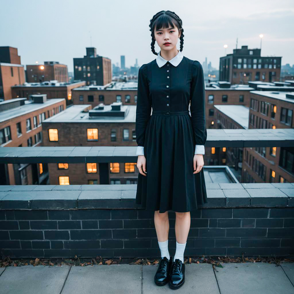 Portrait of a young Asian woman with proportionate body and braided pigtails wearing a black minimalist dress with white collar and long sleeves, styled like Wednesday Addams. She stands on a rooftop with an urban cityscape background during ethereal lighting hours. She is wearing vintage black shoes with white socks.