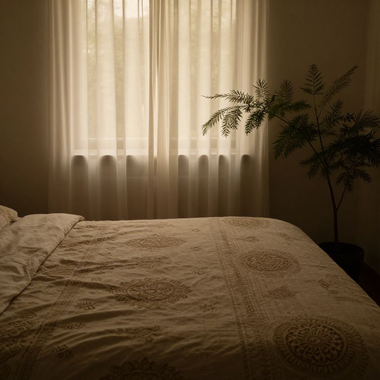Subdued lighting filtering through sheer curtains in a tranquil bedroom, highlighting intricate patterns on the bedspread and the delicate texture of plants nearby, a warm, intimate ambiance perfect for relaxation and reflection.