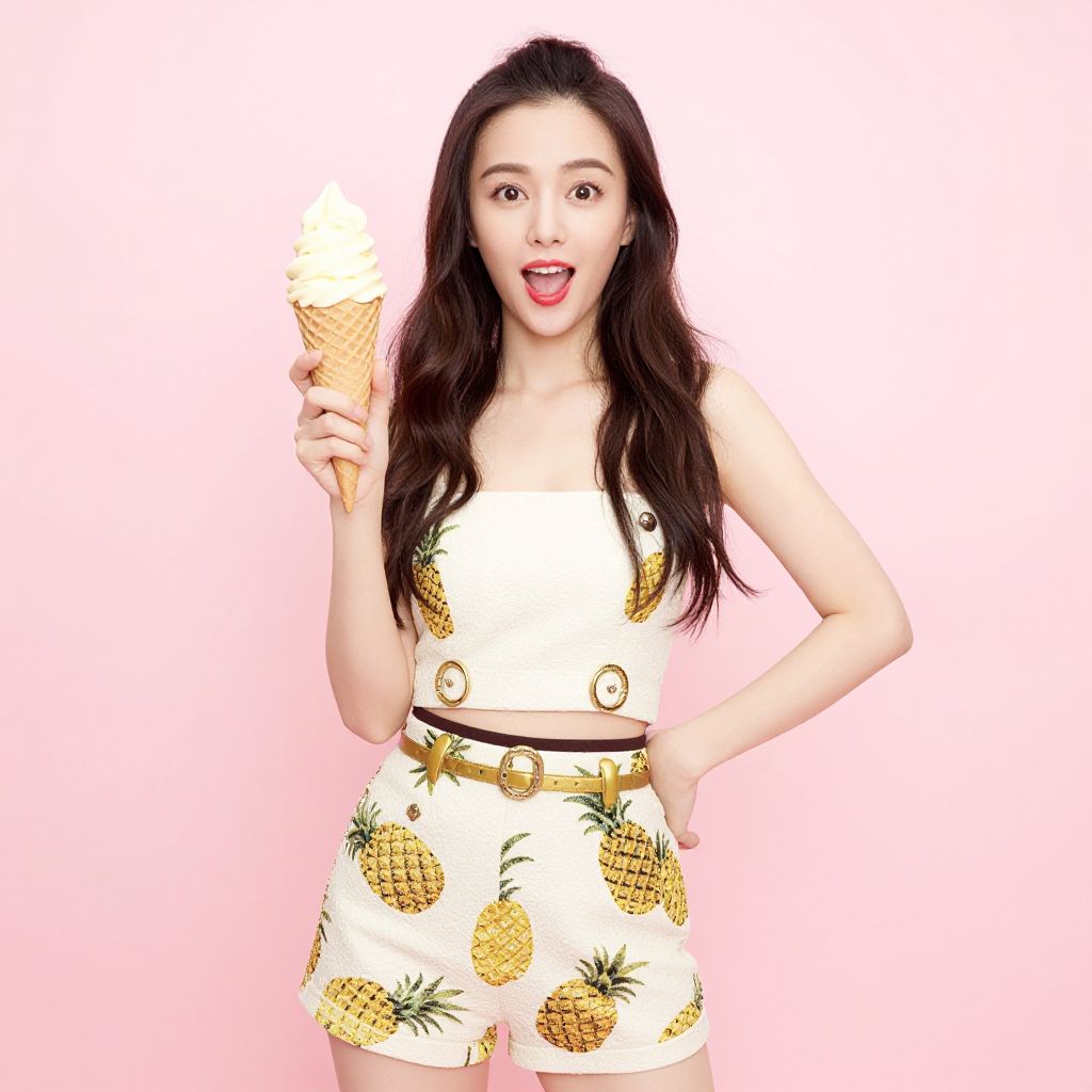Asian woman with long black hair, wearing pineapple-patterned white top and shorts, holding a waffle cone ice cream, pink background.