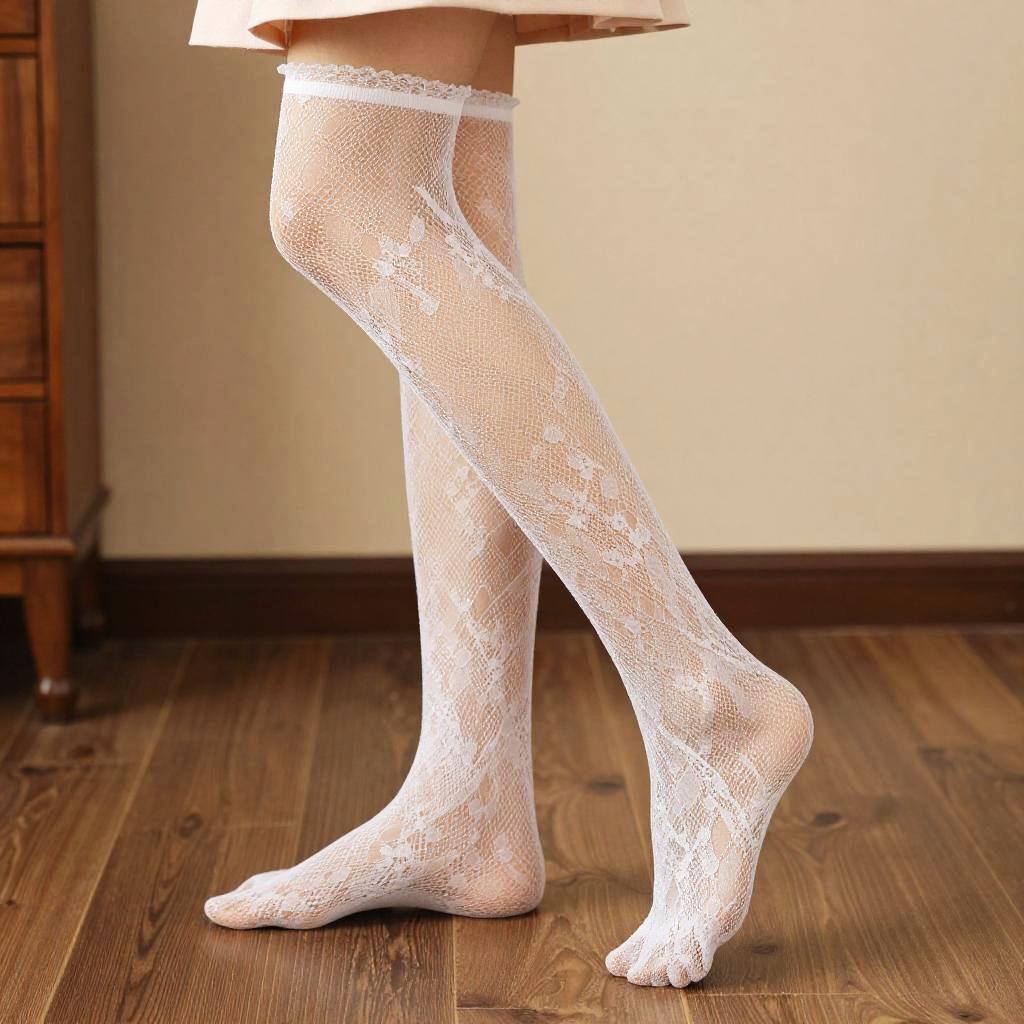 Mary Janes with tights, vintage style, soft lighting, delicate lace tights, elegant young woman in a cozy room, warm color palette, detailed textures, classic fashion