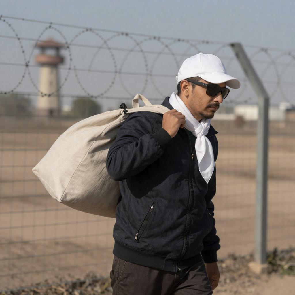 Photograph of a man in a dark jacket, sunglasses, and a white scarf, carrying a large bag over his shoulder. He stands behind a barbed wire fence, with a blurred tower in the background. The man wears a white cap and dark pants, with sunlight casting shadows on his face and the ground.