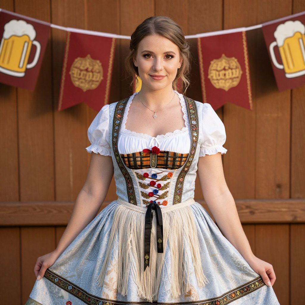 Photograph of a smiling young woman in a traditional Bavarian dirndl dress with white blouse, black and red lace, and blue apron, standing
