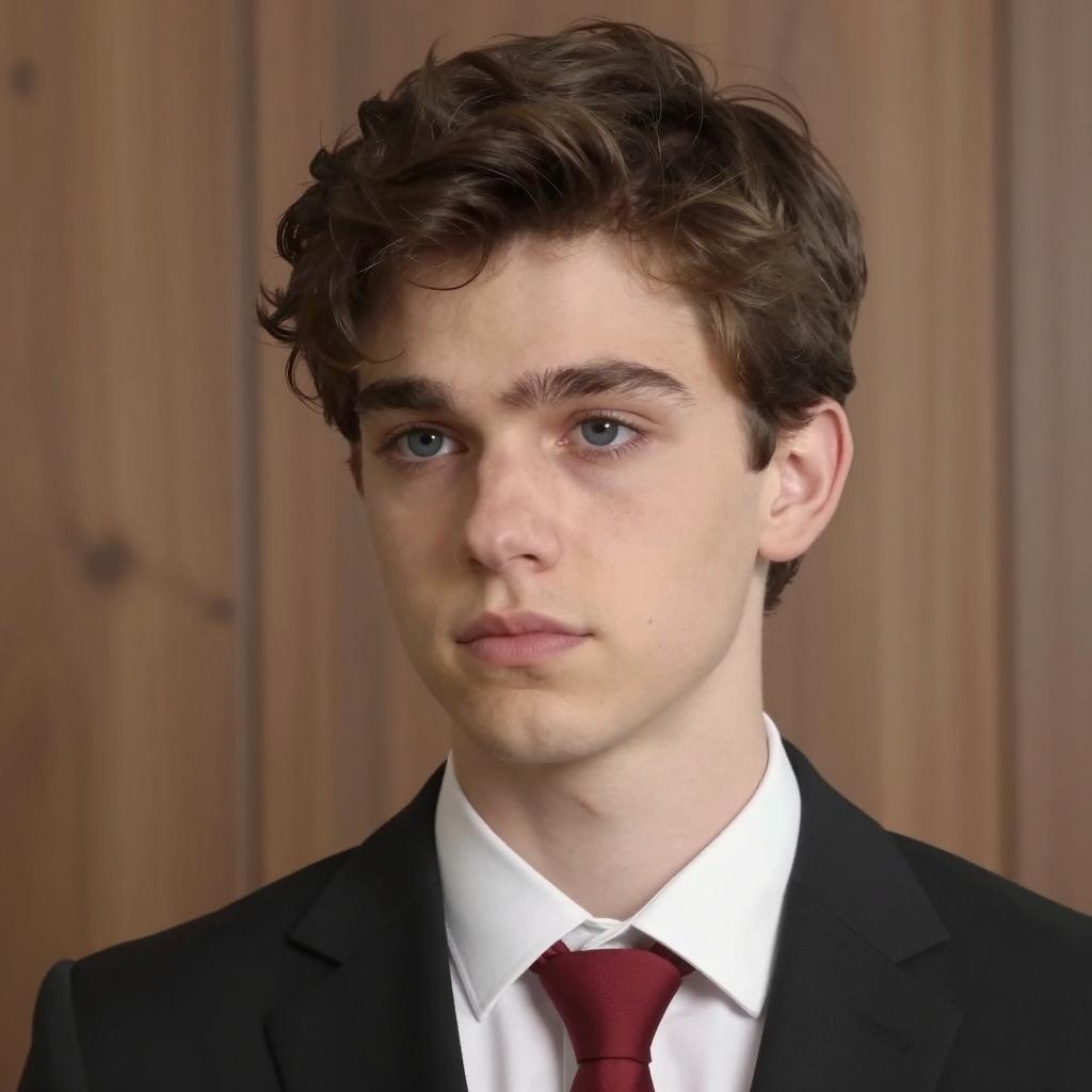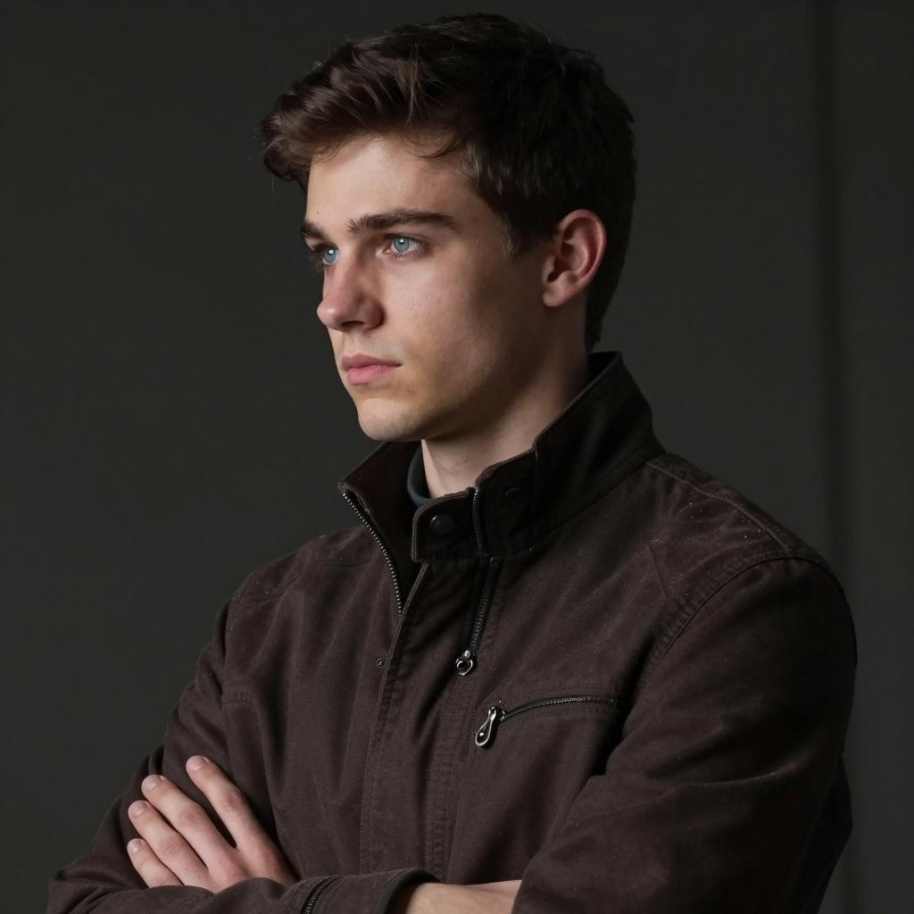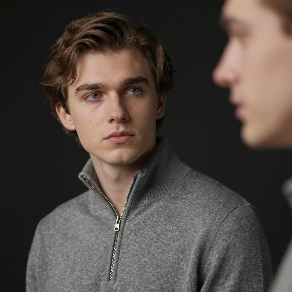 A young man with wet, dark brown, tousled hair, fair skin, and intense green eyes. He wears a grey, hooded shirt with a slight sheen from sweat. He looks to the right with a determined expression. Smoky, dark background. Another person partially visible on the right.
