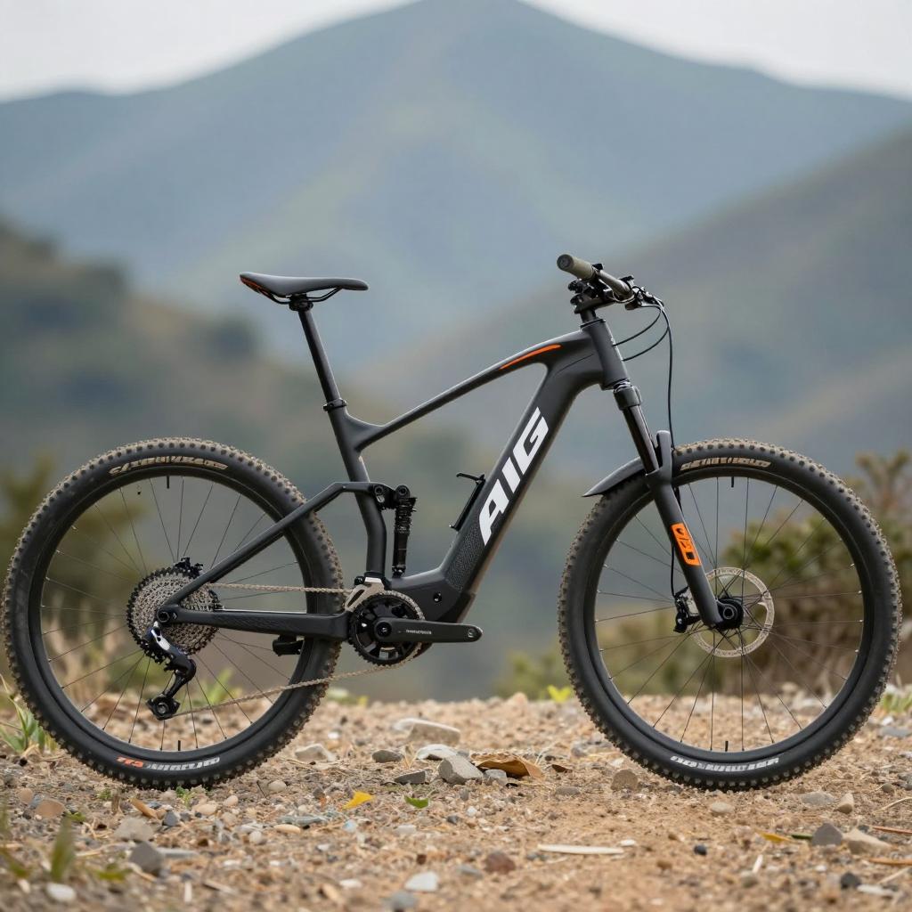 Focal Length riding electric mountain bicycle at mountains nature, futuristic design, new technology, quality and new style shaped frame, extraordinary frame shape, carbon, black matte color and white, orange decals, letter A, letter G on down tube, dirt,hyper realistic, side view,