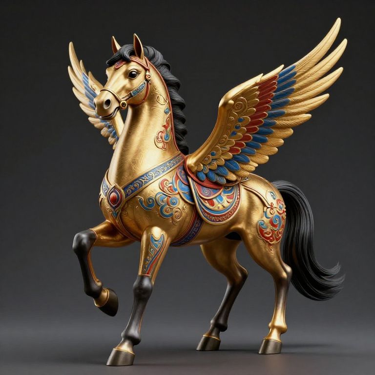 Detailed CGI of a gold Pegasus with vibrant blue, red, and gold feathered wings, adorned in intricate, colorful patterns and jewelry, against a