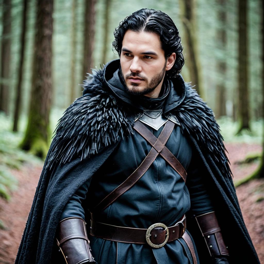 Game thrones halloween,solo, black hair, armor, outdoors, blurry background, tree, chainmail, 1boy, standing, blurry, male focus, facial hair, closed mouth, 1girl, long sleeves, black eyes, looking at viewer