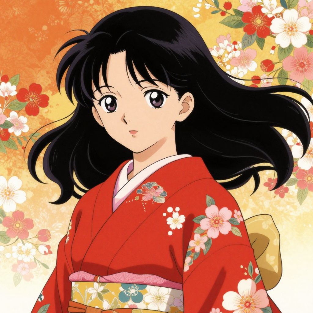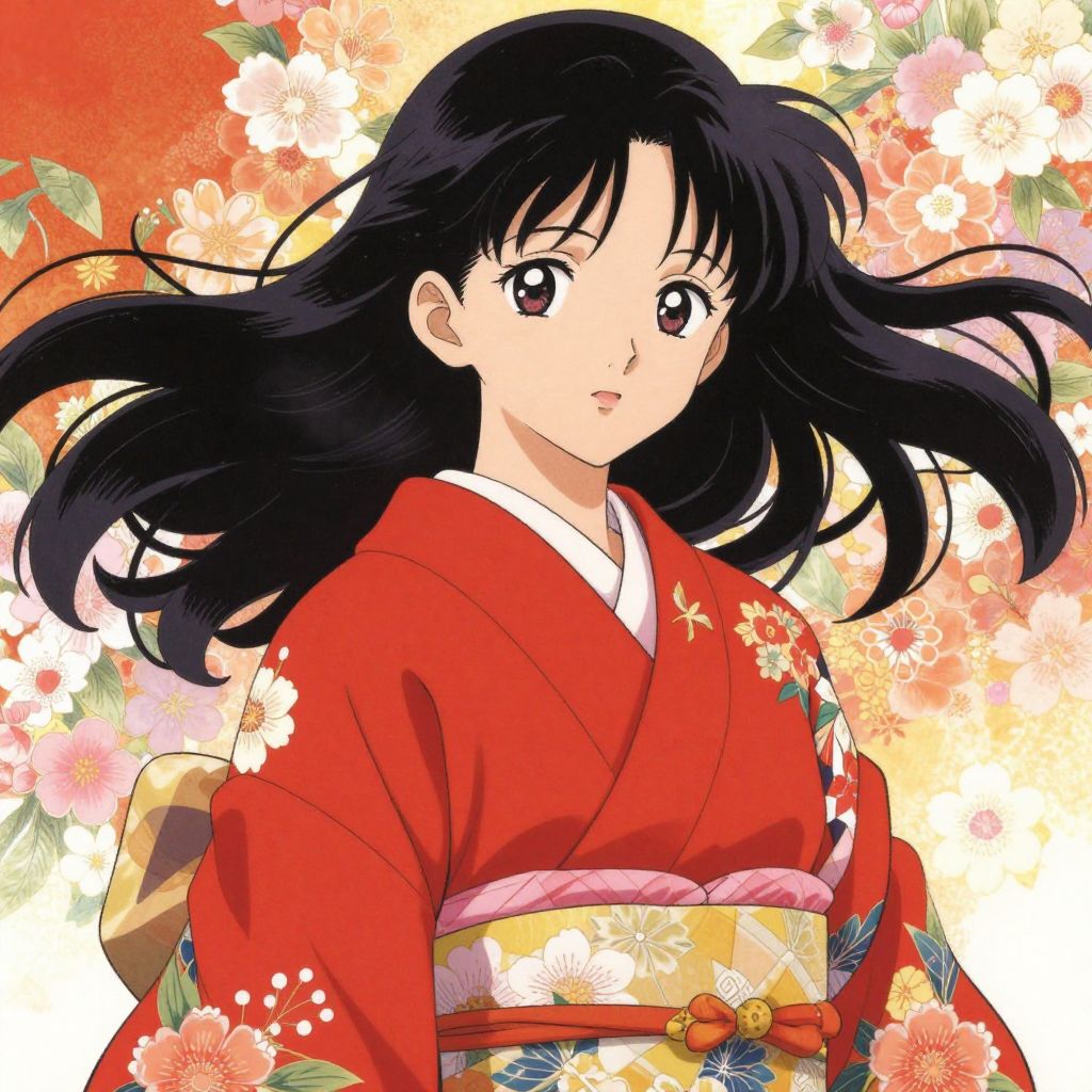 A vibrant digital illustration in the anime style by Yuko Shimizu, featuring a young woman with flowing black hair and expressive eyes, adorned in a traditional red kimono with floral patterns against a warm, floral backdrop.