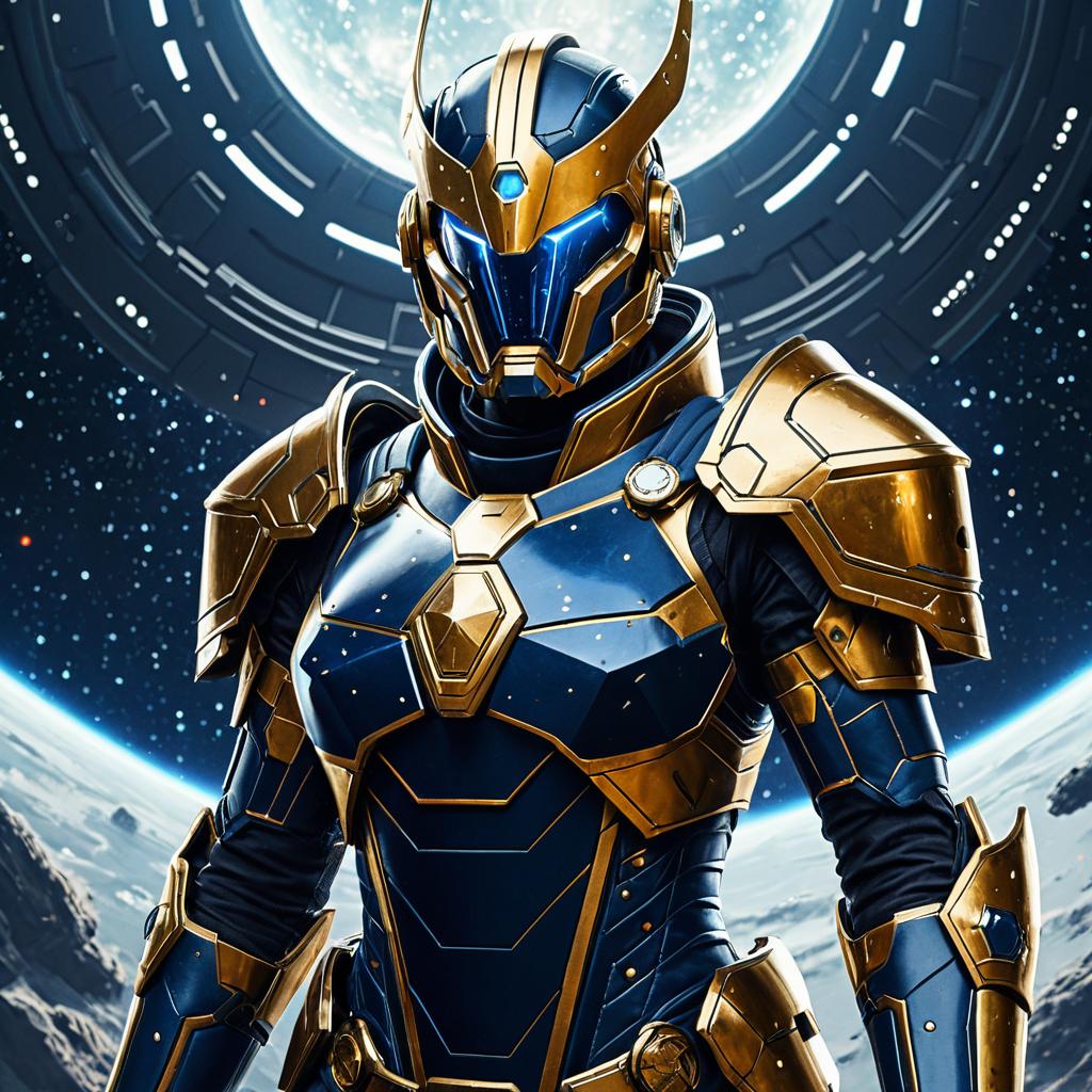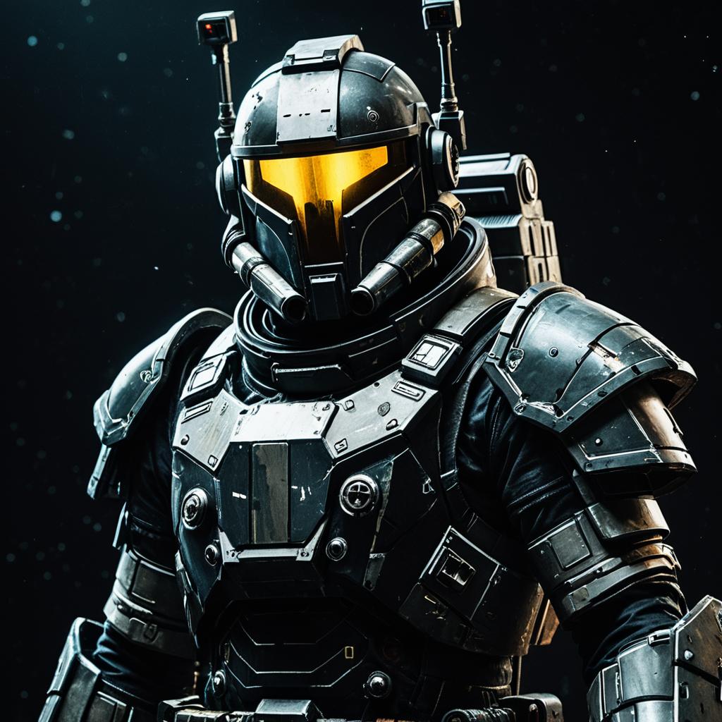 Portrait of a futuristic space bounty hunter wearing advanced powered armor with dark metallic tones and glowing yellow visor. The armor features heavy plating, intricate mechanical details, and high-tech components, capturing a space opera aesthetic in concept art style.
