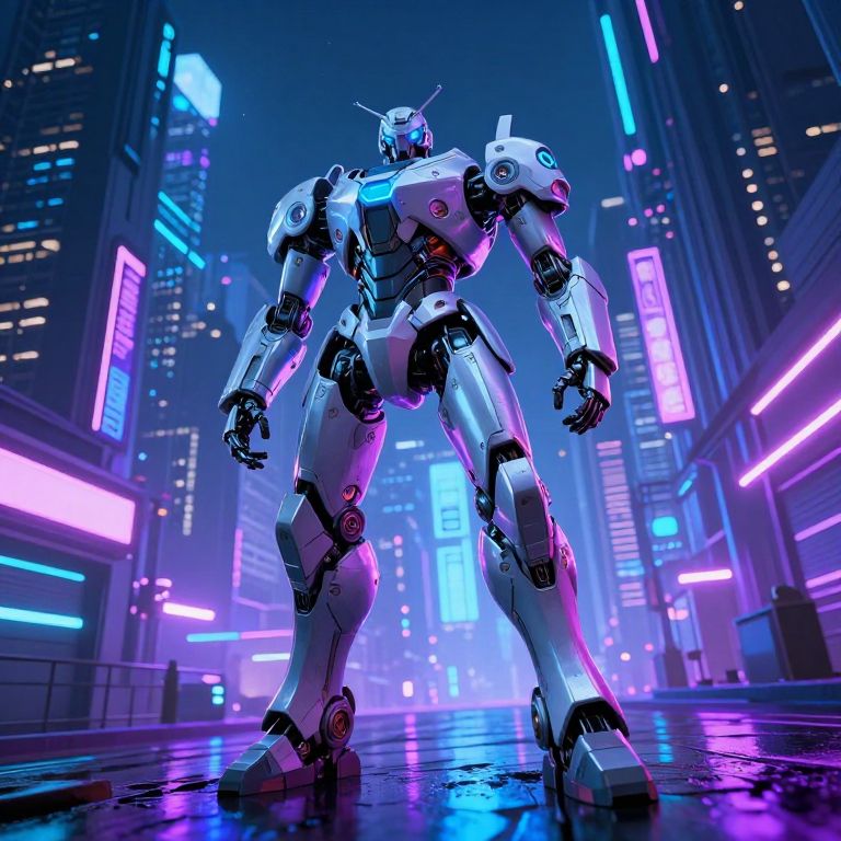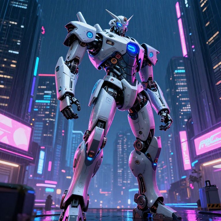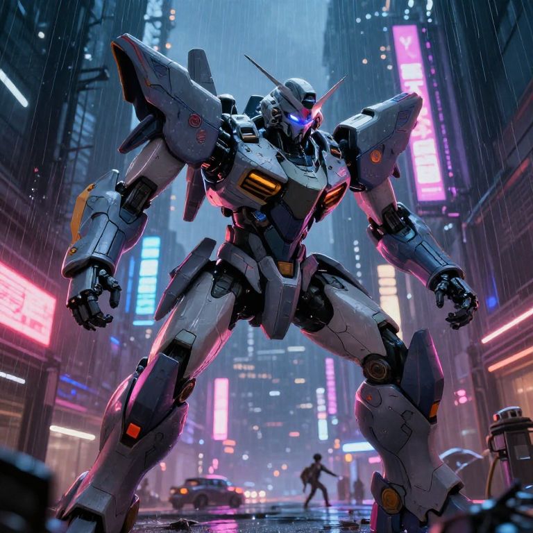 Niji 5 futuristic mech suit battle scene, intense action pose, neon lights, rainy night city, high contrast shadows, digital art, richly detailed environment, cinematic perspective