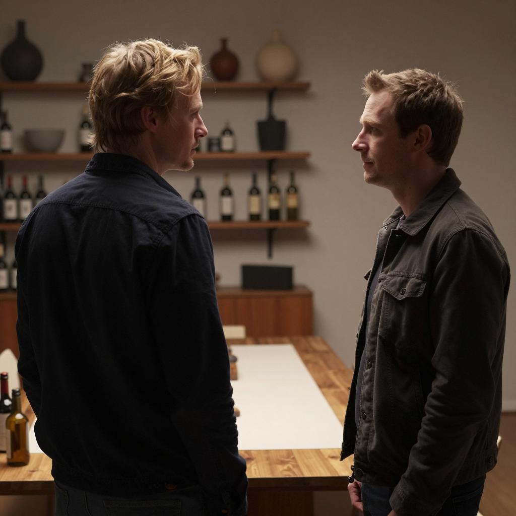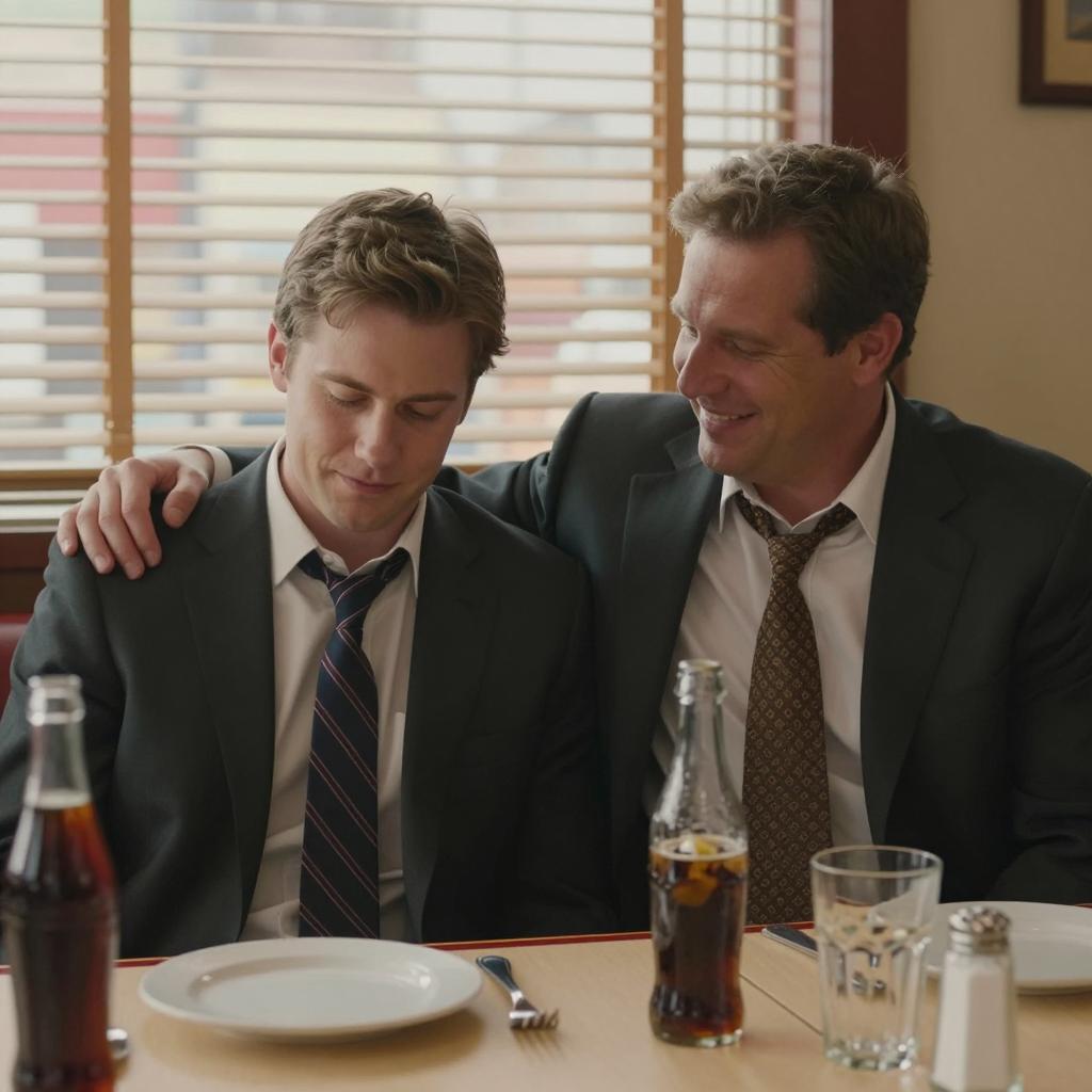 Two men in a diner. Man on left, brown hair, medium build, dark suit, white shirt, striped tie, eyes down. Man on right, brown hair, medium build, dark suit, open collar, patterned tie, arm around left man, smiling. Window blinds in background, soda bottle, glass, and saltshaker on table.