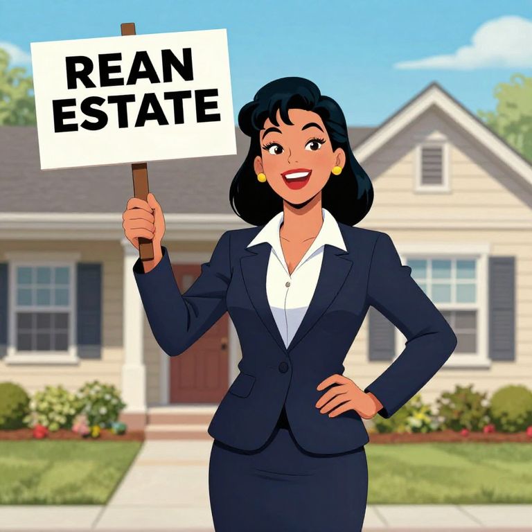 Illustration of a happy Latina woman in a 1980s comic art style, dressed in a navy blue business suit with a white shirt, holding a real estate sign in front of a suburban house. The background features a beige house with a brown door and windows, framed by green grass and shrubs. The image captures a modern, detailed comic art aesthetic.