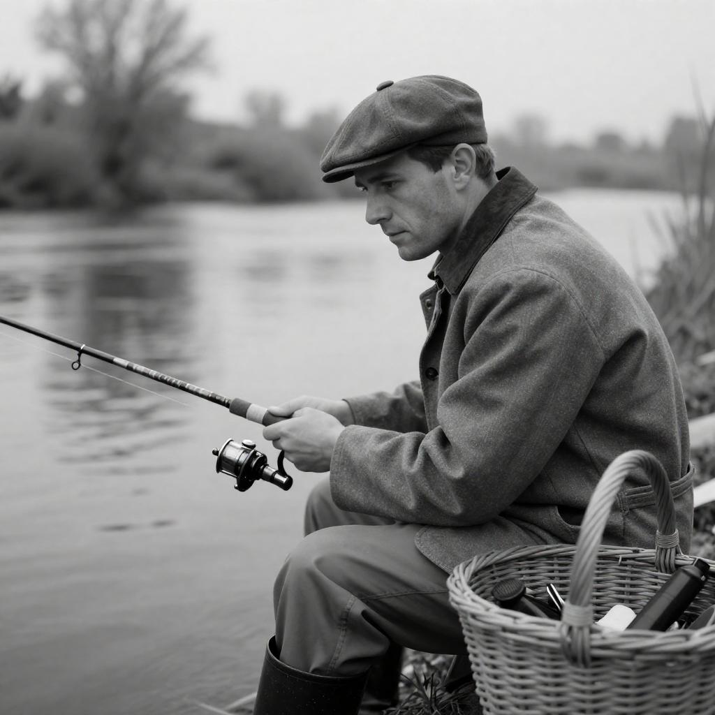Photograph of a man with fair skin and brown hair, wearing a gray flat cap and wool coat, sitting by a sunlit lake. He is focused on a wicker basket containing white plates, silverware, and a wine bottle. The bright, blurred lake and green trees form the background.