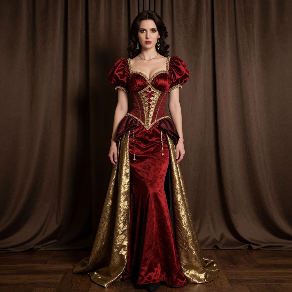 Photograph of a pale-skinned woman with black curly hair wearing a red velvet Renaissance-style gown with gold accents, standing against dark brown curtains.