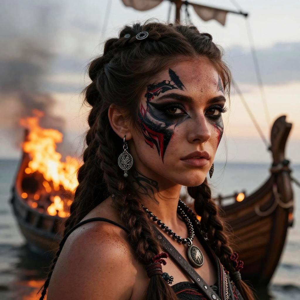 Portrait of a female Viking warrior with black and red war paint designs on her face, heavy contouring to appear battle-hardened, wild braided hair adorned with Norse charms. She wears ornate earrings, a necklace, and leather straps. In the background, a wooden Viking longship is ablaze on water at dawn, creating an intense and dramatic scene.